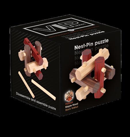 A combination of Stewart T. Coffin’s ‘Nest’ designs and his ‘Pin-Hole’ puzzle. Both created in 1976. Our design is a light version of his Cuckoo’s Nest and Locked Nest. We drilled holes at a 90° angle, while Stewart used a 70° angle. When assembling or disassembling this Nest-Pin puzzle, the relationship with his Pin-Hole design becomes clear. Stewart T. Coffin, born in 1930, is an American puzzle maker. He is considered by many to be one of the best designers of polyhedral interlocking puzzles in the world. Puzzles designed by Stewart may be freely reproduced, provided you contact him in advance and send him a few copies. Stewart, still alive at the time of this release, has personally given us permission to reproduce his puzzles.