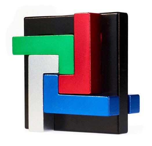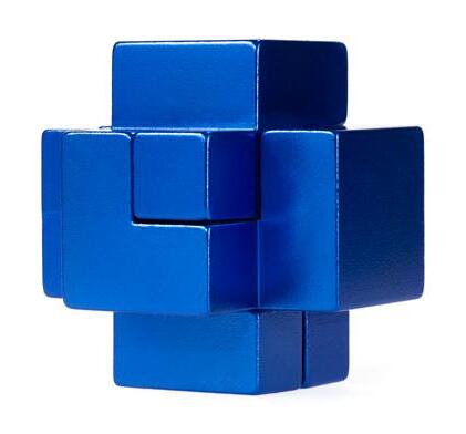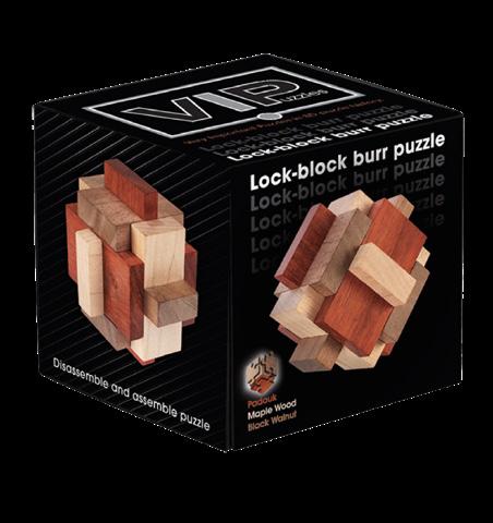 Not a traditional burr puzzle, however still a burr. A burr puzzle is an interlocking puzzle consisting of notched sticks, combined to make one 3D, usually symmetrical unit. Quality burr puzzles are precision-made for easy sliding and accurate fitting of the parts. In recent years the definition of “burr” is expanding, as puzzle designers use this name for puzzles not necessarily of stick-based pieces. This lock-block puzzle is a perfect example.