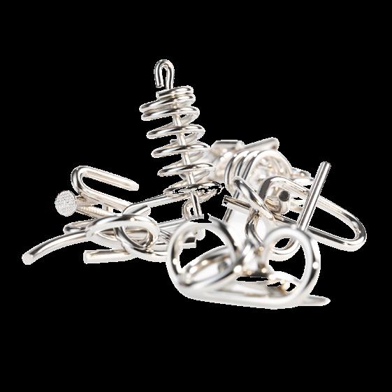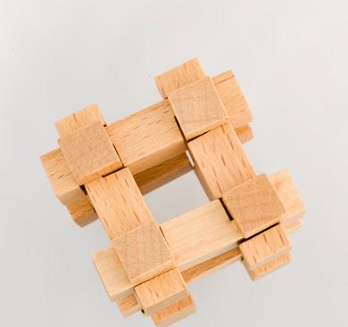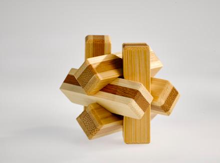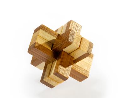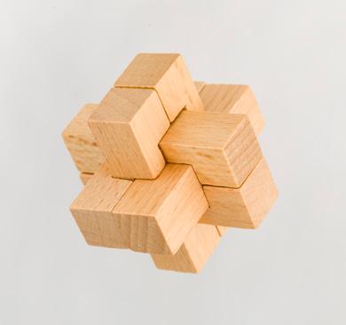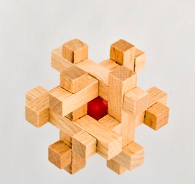 This burr puzzle is a perfect example to illustrate the impact of a ‘key’ puzzle part. With the key part well positioned, another part can be removed. When then taking out the key part from the whole, the remaining puzzle parts may collapse into bits & pieces.