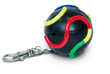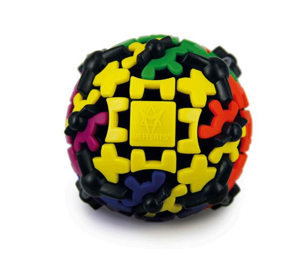 Hold the ball with both hands and twist in opposite directions. As the gears move, the colors change on each facing as well as the black frame. Solve by framing 6 sides, each with a solid color.