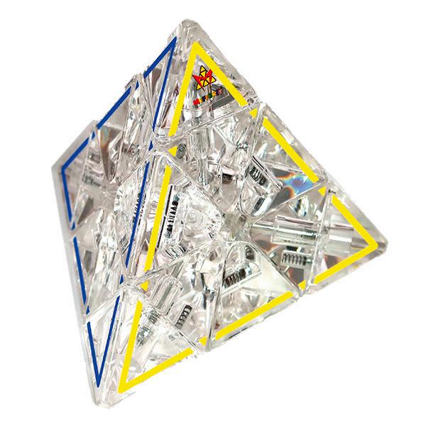The Crystal clear Pyraminx can be scrambled by twisting any 2 halves or by rotating the tips. Solve it by creating a single color outline on all 4 sides.