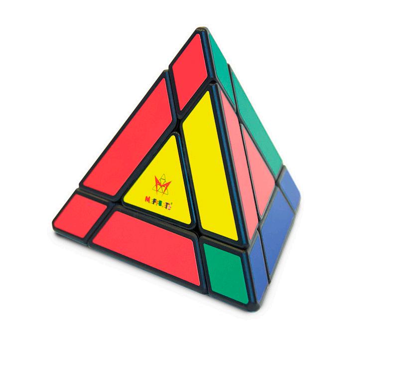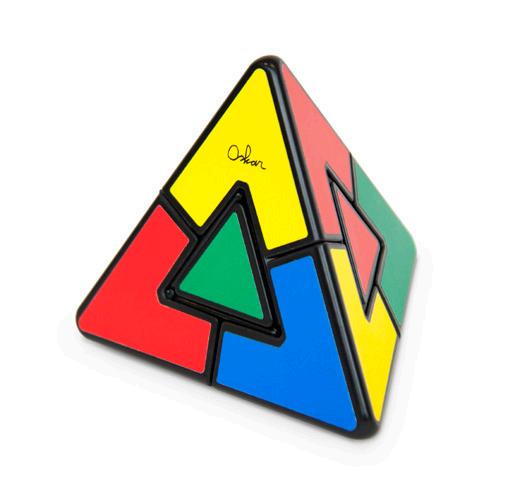 This 50 years old Pyraminx, invested by famous puzzle inventor Uwe Meffert, has been there since the beginning. Start with the colors scrambled on all sides. Twist any 2 halves or rotate the tips to change the colors. Solve by creating 4 solid sides of color.