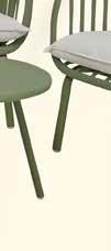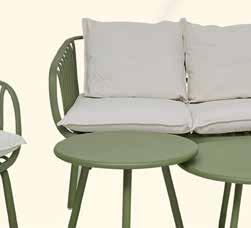 Sofagruppe med sofa, to stoler og to bord. Grønne, helstøpte plastseter på stålunderstell. Puter i polyester og bord i stål.
