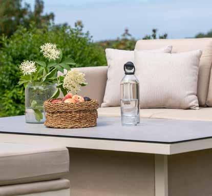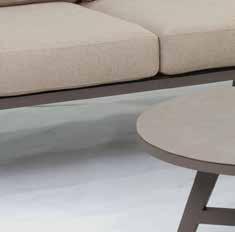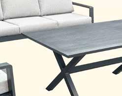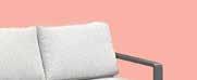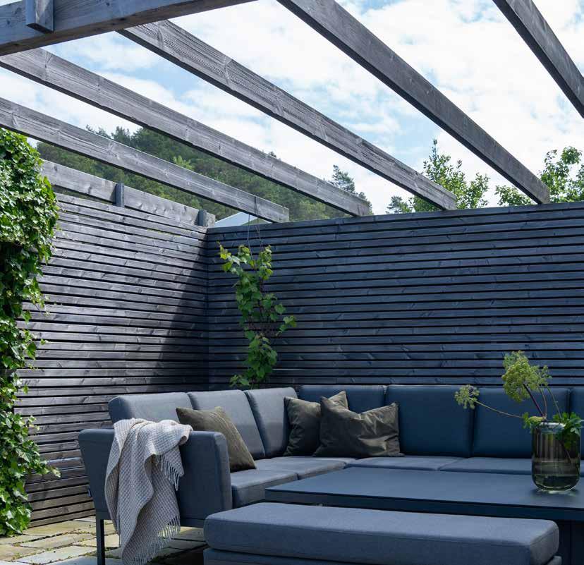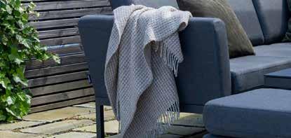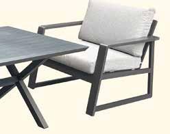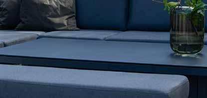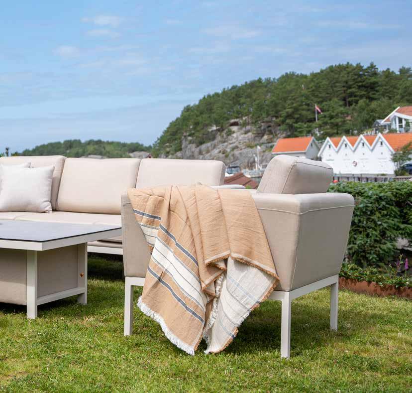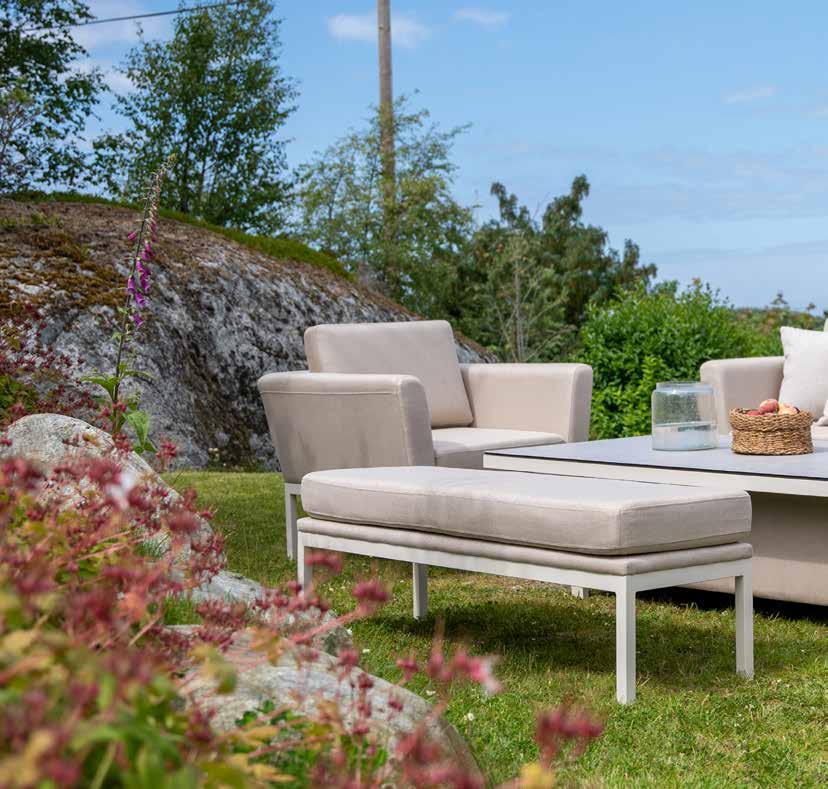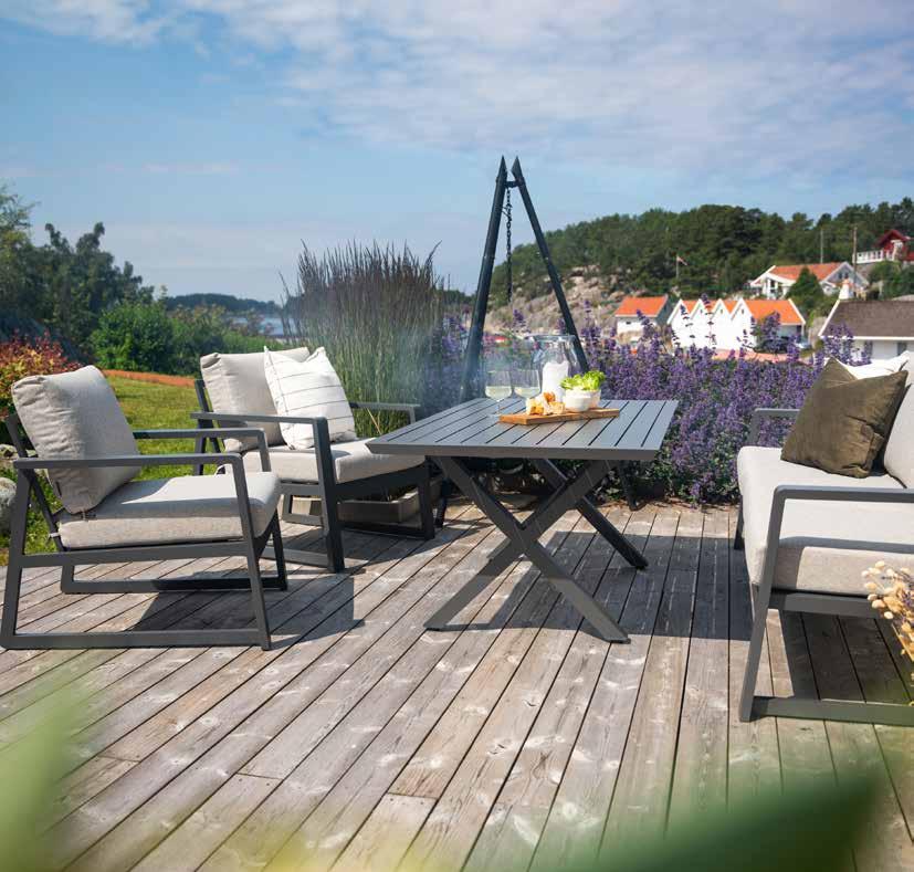 Stilren, moderne hagegruppe med faste og hurtigtørkende allværsputer. Vannavvisende tekstil og Quick Dry Foam, kan stå ute i all slags vær.