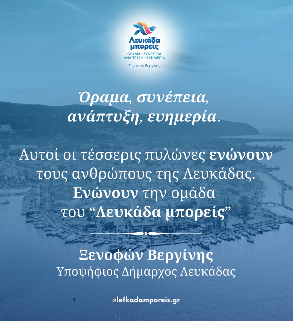 που αγαπάμε, η Λευκάδα που μας αξίζει. Θα παραμερίσουμε τα όποια μικρά και ασήμαντα που μας χωρίζουν και θα αναδείξουμε τα πολλά και σημαντικά που μας ενώνουν. Θέλουμε