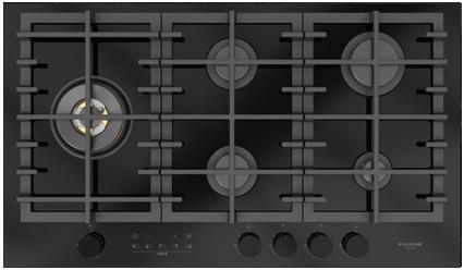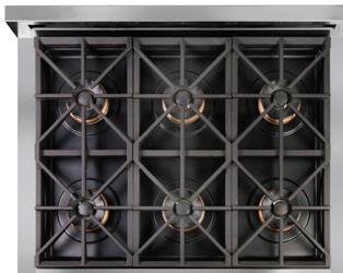 Available in Stainless steel Natural gas supply with the possibility of conversion to LPG, 6 Gas Crescendo burners, Dual controls adjustable from low to high flame, Flat surface with porcelain enamel matte black, Electronic ignition, Gas detection and stop system, Professional cast iron grates, Professional steel knobs