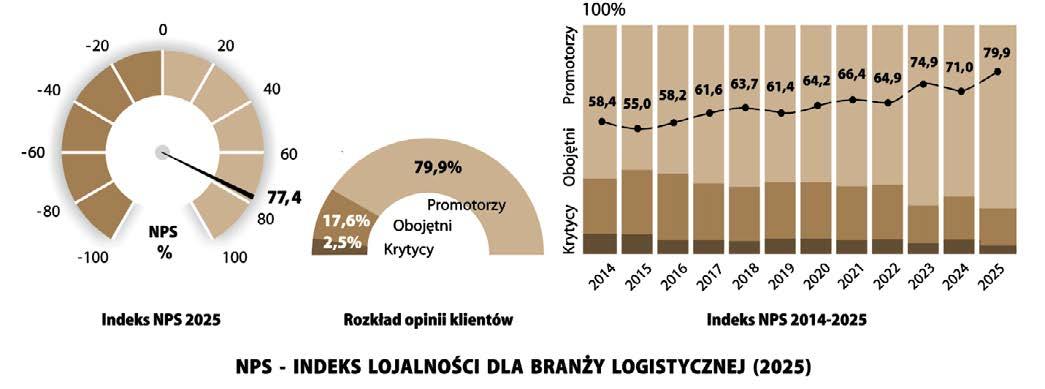 Prezentowane wyniki pokazują, jak często dana firma logistyczna wskazywana jest przez kluczowych klientów jako firma, którą bez zastrzeżeń poleciliby innym albo odradziliby korzystanie z jej usług, lub byłoby to im obojętne. W badaniu wzorujemy się na najbardziej popularnej na świecie metodzie badania lojalności klientów, opracowanej przez Fredericka F. Reichhelda. Indeks NPS (Net Promoter Score), który może przyjmować wartości od -100% do +100%, stanowi różnicę pomiędzy zdecydowanymi zwolennikami a krytykami danej firmy.