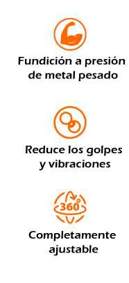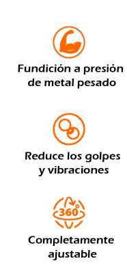 El brazo con doble agarre sobre bolas engomadas permite la amortiguación de golpes y vibraciones. Estructura metálica de fundición a presión de alta resistencia.
