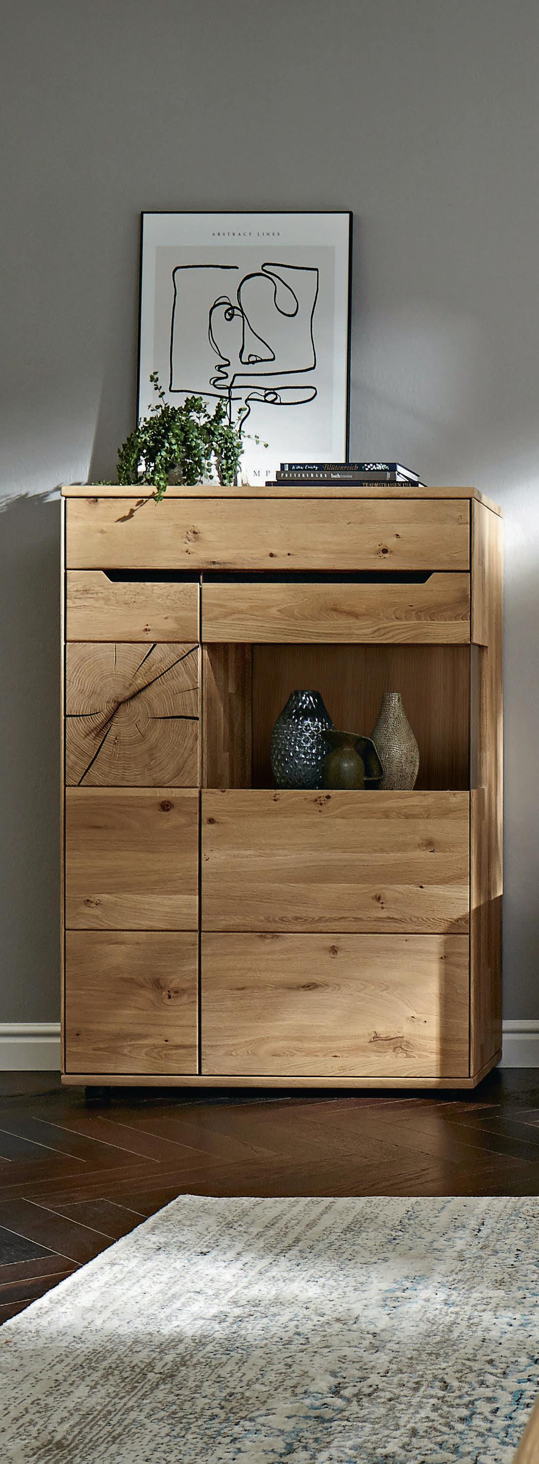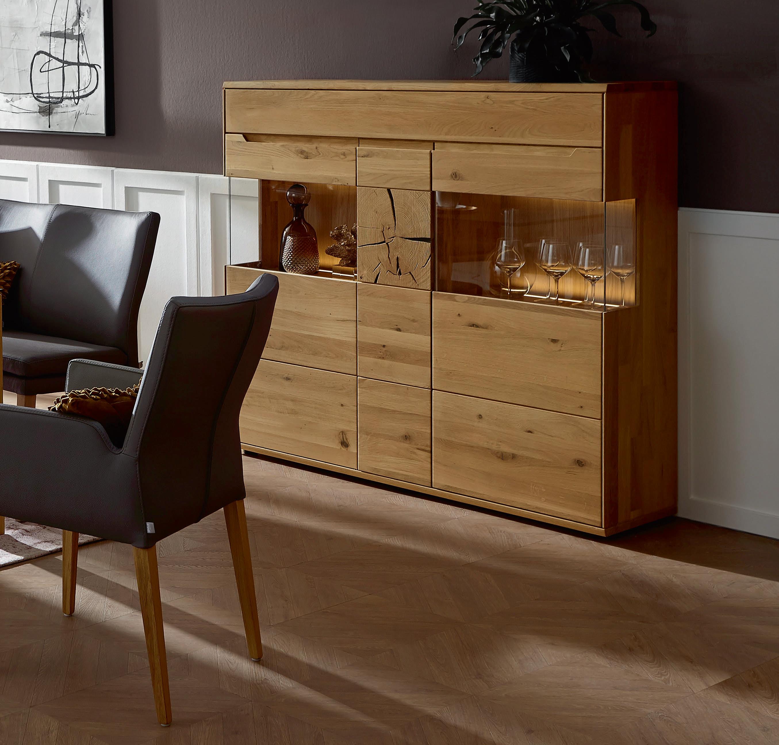 05 Global Wohnen Amora Highboard in Wildeiche massiv, bianco geölt, Griffeisten natur, mit Hirnholzakzent, BHT ca. 152 × 136 × 40 cm, ohne Beleuchtung, 3.298,–* Global Wohnen Amora Highboard, wie beschrieben und abgebildet als Variante mit Beleuchtung, 3.862,–*