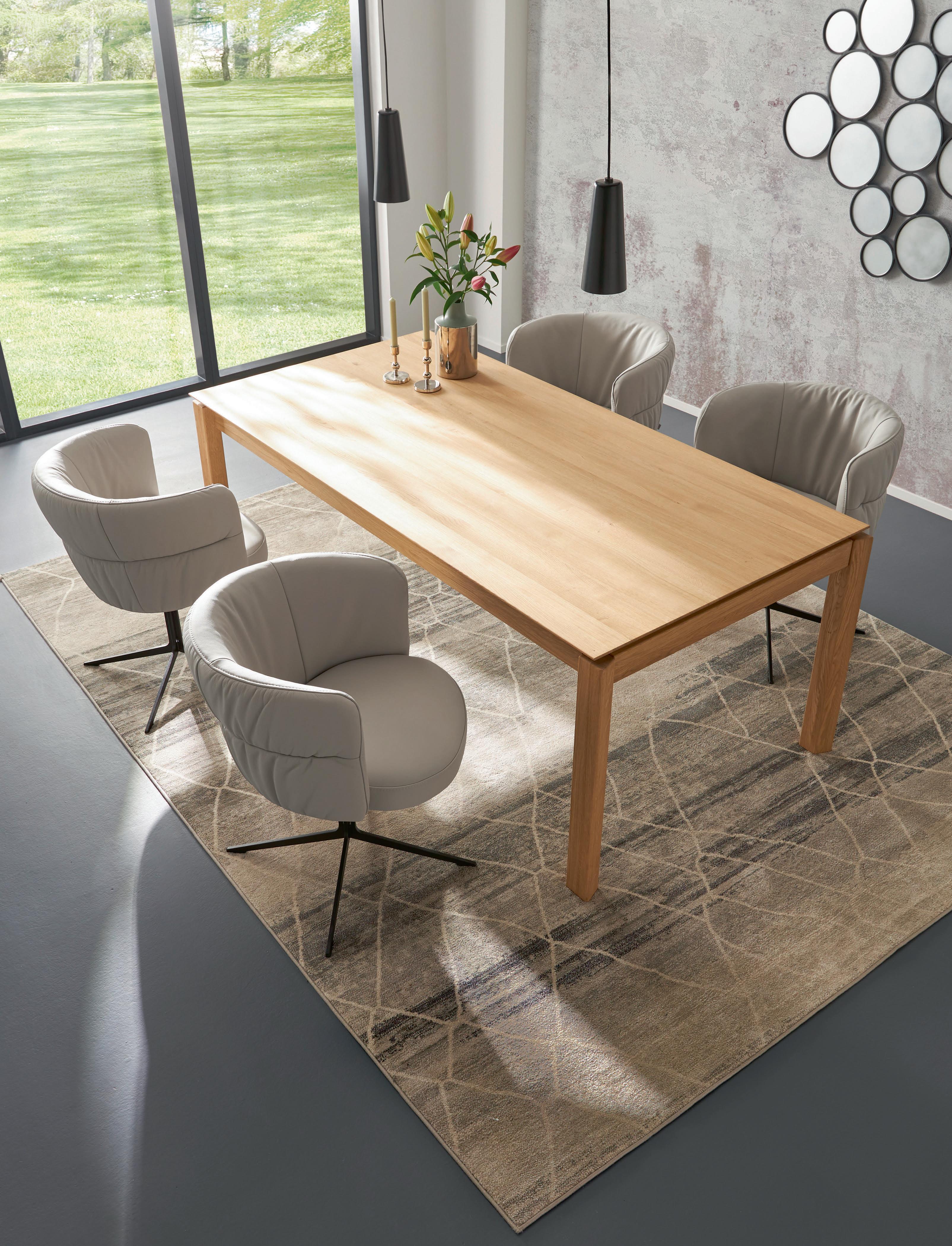 Ausziehtisch F163, Tischplatte Eiche bianco massiv, Gestell Massivholz mit Edelfurnier in Eiche bianco, inkl. einer innenliegenden Klappeinlage ca. 97 cm, LBH ca. 180 (277) × 90 × 76 cm, 2.698,–*