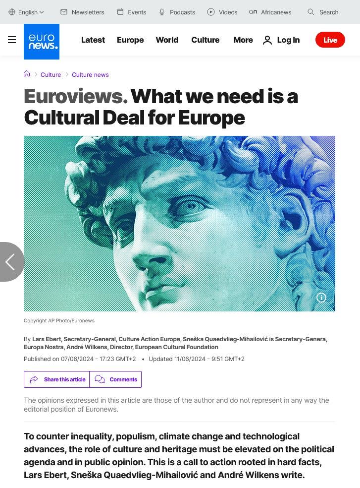 2024 was marked, in Europe and the world, by an acceleration of political and geopolitical developments, which challenged, sometimes brutally, the values that form the essence of what our continent, and more particularly the European Union, strives to defend. Faced with this mounting number of crises, it is increasingly important to nurture what brings people together, and that is exactly the role of culture and cultural heri tage. Based on the experience acquired through its 60 years of continuous action, Europa Nostra has strongly positioned itself to make its voice heard in support of peace and democracy, and to put culture and cultural heritage where it belongs: at the core of Europe’s future strategic priorities and policies. This mobilisation was particularly strong in the preparation of one of the landmarks of the year, namely the European Elections, which provided the occasion, together with our partners from Culture Action Europe and the European Cultural Foundation, to issue, renew and strengthen our call for a Cultural Deal for Europe, with a strong cultural heritage component. Now more than ever, solidarity, cooperation and a deep sense of shared values and responsibility must guide our efforts.
