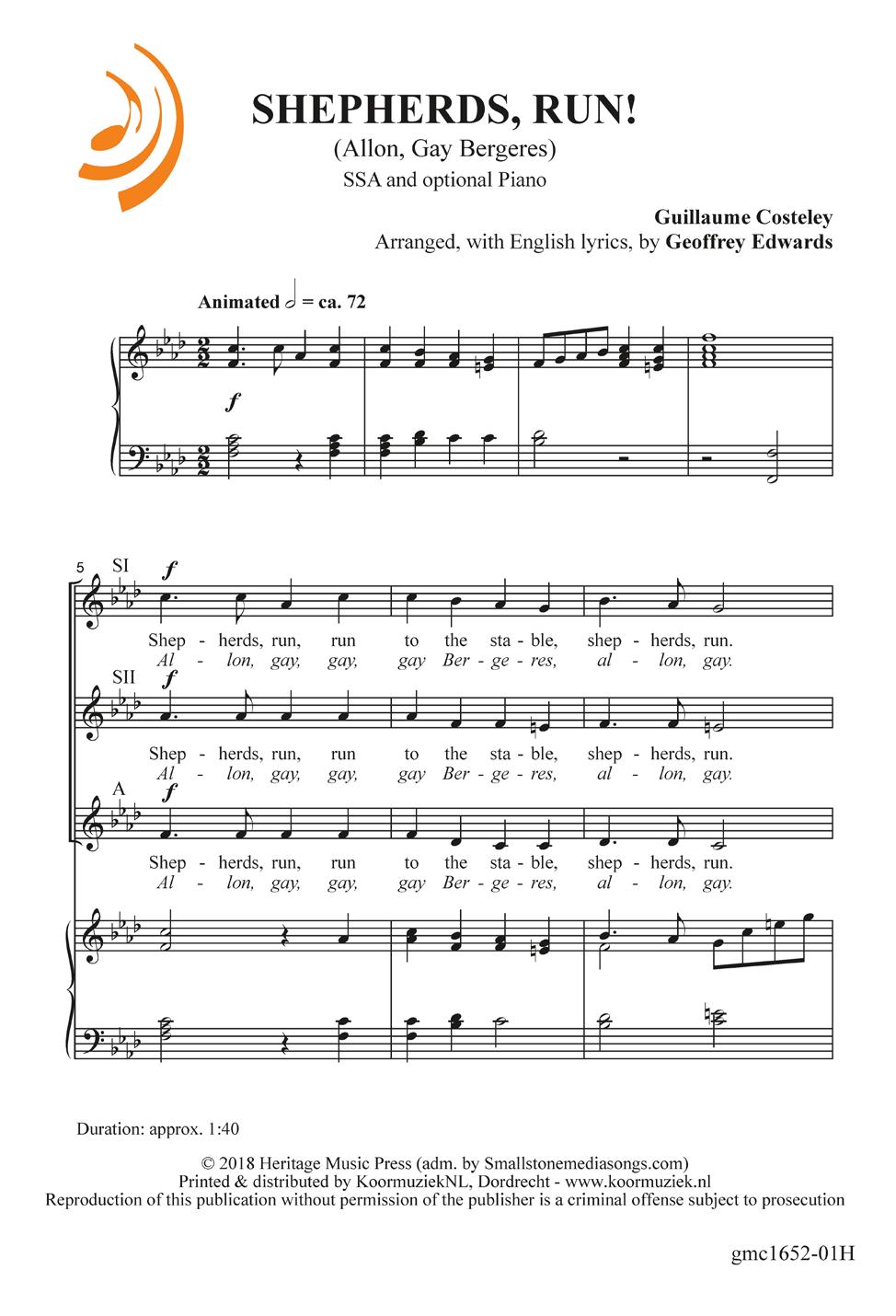UITDAGING-ALERT! Duik eens in deze 16e-eeuwse koor klassieker in een oogverblindende (of oor?) zetting voor vrouwenkoor! Gebruik dit arrangement op de manier die bij de gelegenheid past: Met Engelse of Franse tekst, begeleid of a capella. ‘Shepherds, run!’ is heel flexibel uit te voeren. Verras uw publiek in de decembermaand met deze heerlijke uitgave.