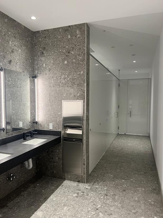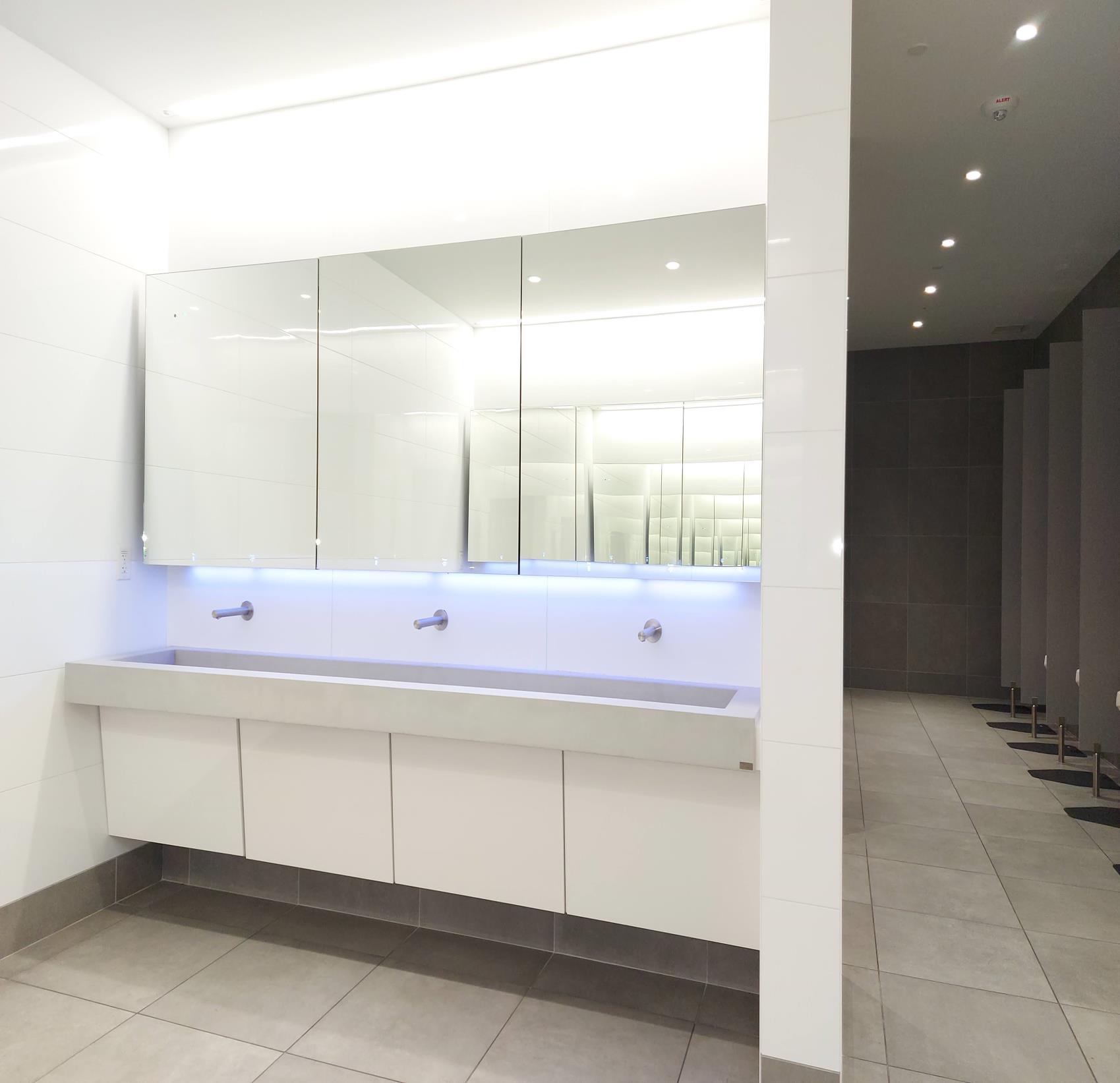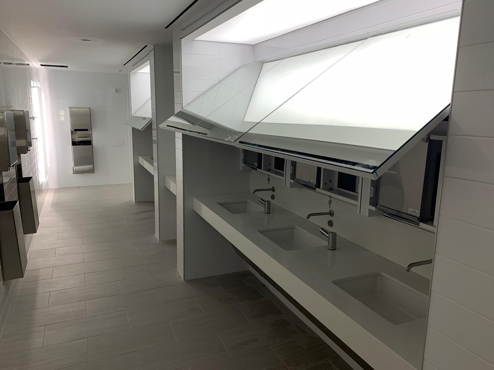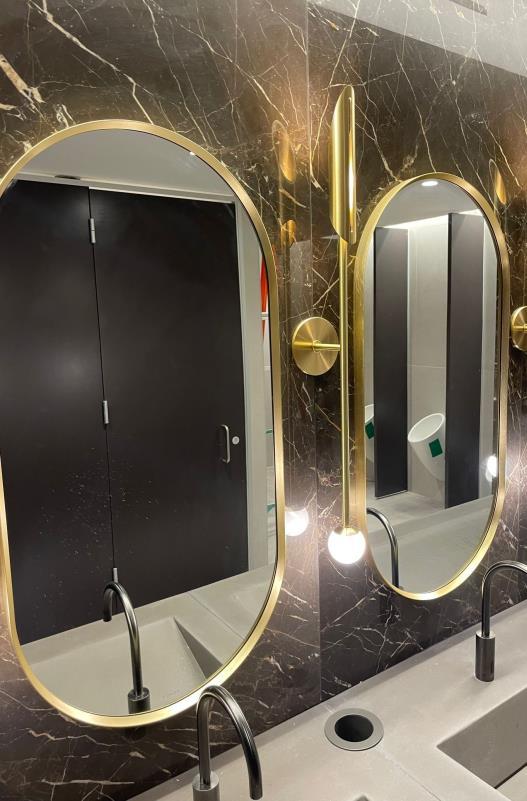 • Preferences include concealed behind the mirror, sensor taps, foam soap cartridges (recyclable), automatic hand dryers, and paper towel dispensers.