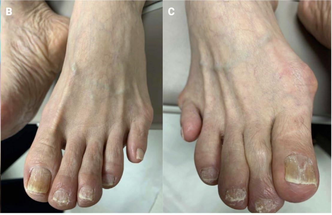A 71-year-old East-Asian female presented with a 2-year history of constant bilateral cyanosis of all toes (Figure 1A-B), not