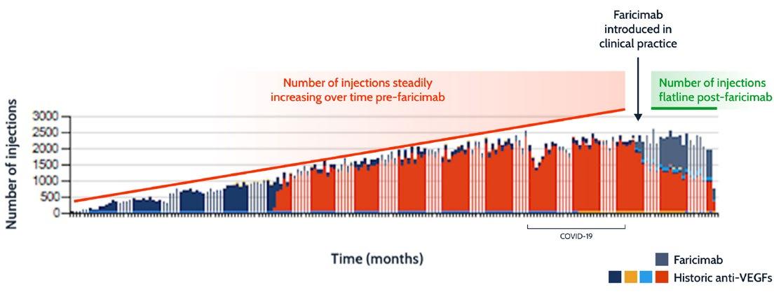 Real-world evidence has shown that extended treatment intervals with faricimab result in fewer injections and fewer appointments, freeing up capacity with sustained effectiveness and low rates of ocular adverse events.40-44 Ultimately, the introduction of faricimab is an important part of the long-term solution to overcome the clinic capacity crisis.40-44