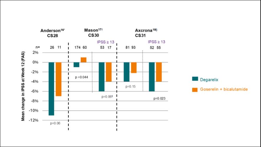 16. Mason M et al. Neoadjuvant androgen deprivation therapy for prostate volume reduction, lower urinary tract symptom relief and quality of life improvement in men with intermediate- to high-risk prostate cancer: a randomised noninferiority trial of degarelix versus goserelin plus bicalutamide. Clin Oncol (R Coll Radiol). 2013;25(3):190-6.
