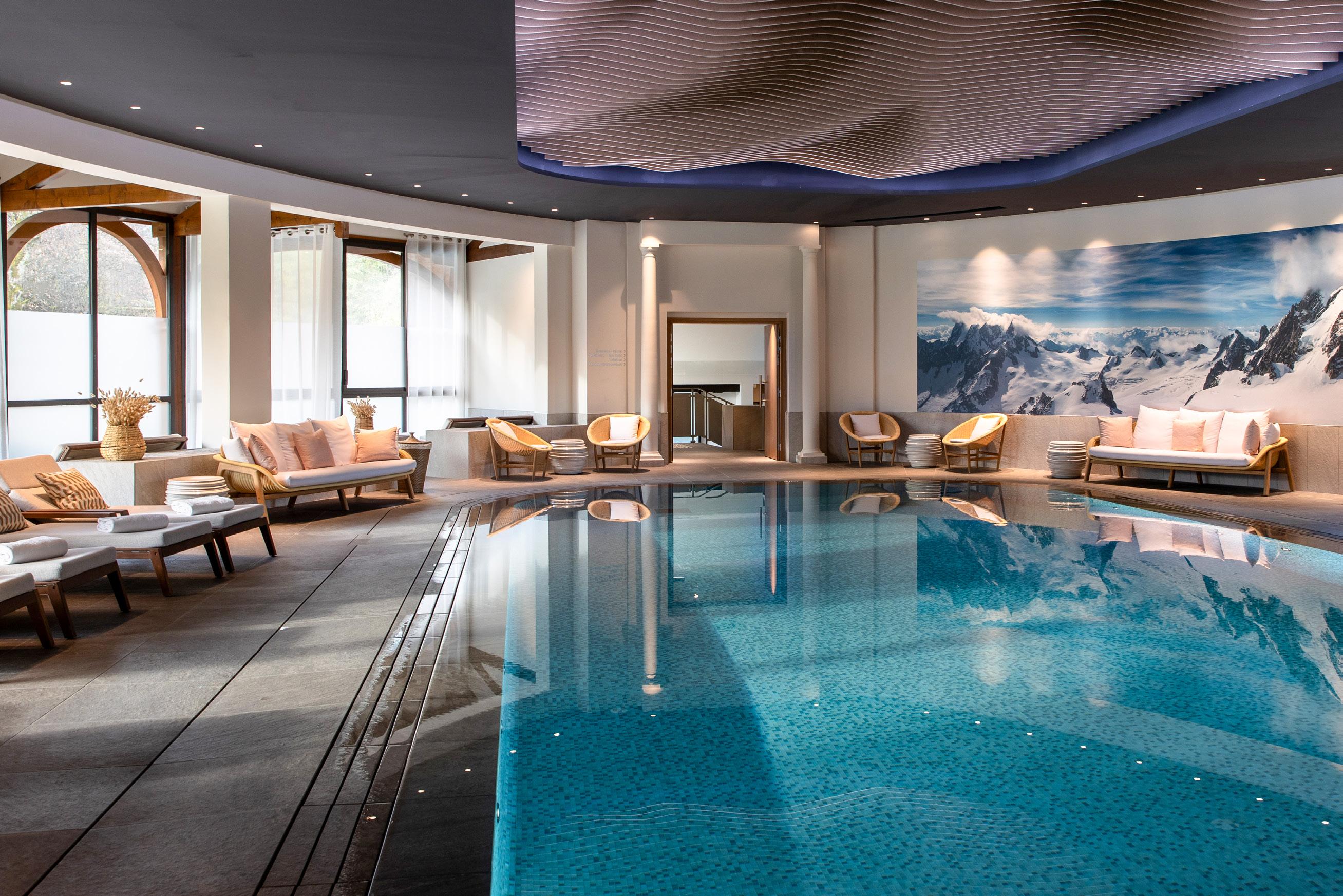 Beautiful interiors by Rémi Tessier include lighting that reflects the circadian rhythms and sound systems under the water of the pool to enable submersive meditation. Works by Damien Hirst adorn the walls and the French artist Jean-Baptiste Huyn has hand-painted the treatment room walls to depict the sunrise and sunset as well as the moon and sun eclipses around every mirror in every room.