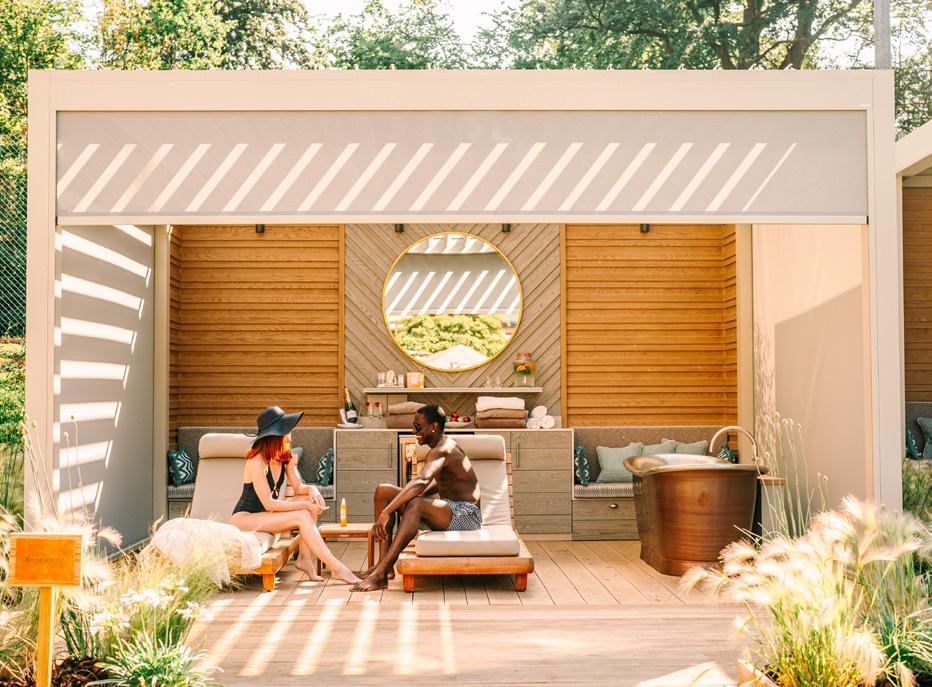 During the day, Sunmoon can be used to provide shelter in spa garden areas thanks to to adjustable drapes and curtains. From dusk onwards, LED lighting creates a relaxing lounge space.