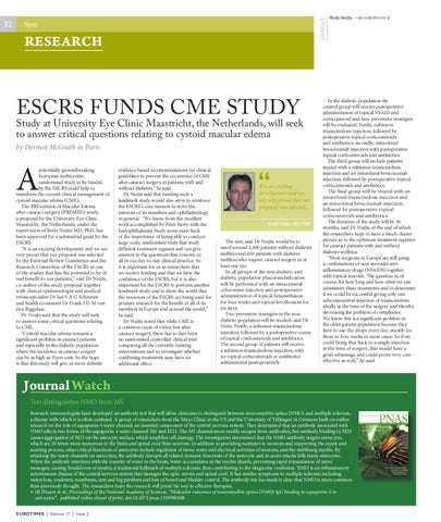 evidence-based recommendations for clinical guidelines to prevent the occurrence of CME after cataract surgery in patients with and without diabetes,” he said. Dr Nuijts said that funding such a landmark study would also serve to reinforce the ESCRS’s core mission to serve the interests of its members and ophthalmology in general. “We know from the excellent work accomplished by Peter Barry with the Endophthalmitis Study some years back of the importance of being able to conduct large-scale, randomised trials that study different treatment regimes and can give answers to the questions that concern us all in our day-to-day clinical practice. So it is important for us as researchers that we receive funding and that we have the confidence of the ESCRS, but it is also important for the ESCRS to perform another landmark study and to show the world that the resources of the ESCRS are being used for primary research for the benefit of all of its members in Europe and around the world,” he said. Dr Nuijts noted that while CME is a common cause of vision loss after cataract surgery, there has to date been no randomised controlled clinical trial comparing all the currently existing interventions and to investigate whether combining treatments may have an additional effect.