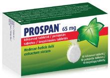 vaistinėse. Nuolaidos skaičiuojamos nuo įprastinės kainos perkant be EUROVAISTINĖS kortelės. Nurodytos kainos gali skirtis perkant internetu www.eurovaistine.lt. Nuo kosulio PROSPAN NERECEPTINIAI VAISTINIAI PREPARATAI PROSPAN, 20 mg/ml, geriamieji lašai, tirpalas, 20 ml 6,26 € PROSPAN, 65 mg, 10 šnypščiųjų tablečių 6,39 € PROSPAN, 7 mg/ml sirupas, 100 ml 6,90 € Veikliosios medžiagos, stiprumas: 1 ml sirupo yra 7 mg Hederae helicis L., folium (gebenių lapų) sausojo ekstrakto (5–7,5 1); 1 šnypščiojoje tabletėje yra 65 mg Hederae helicis L., folium (gebenių lapų) sausojo ekstrakto (5–7,5 : 1); 1 ml geriamųjų lašų yra 20 mg Hederae helicis L., folium (gebenių lapų) sausojo ekstrakto (5–7,5). Indikacijos: ūminio bronchito sukelto kosulio lengvinimas, atsikosėjimo gerinimas. Vartojimo būdas ir dozavimas: „Prospan“ 7 mg/ml sirupas: 1–6 m. vaikams gerti po 2,5 ml 2 kartus per dieną; 6–12 m. vaikams – po 5 ml 2 kartus per dieną; suaugusiesiems ir vyresniems nei 12 m. paaugliams – po 5 ml 3 kartus per dieną. Sirupui matuoti naudoti matavimo taurelę, esančią pakuotėje. Prieš vartojimą buteliuką gerai supurtyti; „Prospan“ 65 mg šnypščiosios tabletės: suaugusiesiems ir vyresniems nei 12 m. paaugliams gerti po 1 šnypščiąją tabletę 2 kartus per parą, 4–12 m. vaikams – po pusę tabletės 3 kartus per parą. Tabletės ištirpinamos vandenyje (apie 200 ml kiekio); jas galima tirpinti tiek karštame, tiek šaltame vandenyje; „Prospan“ 20 mg/ml geriamieji lašai (tirpalas): suaugusiesiems ir vyresniems nei 10 m. vaikams gerti po 24 lašus 3 kartus per dieną; 4–10 m. vaikams – po 16 lašų 3 kartus per dieną; 1–4 m. vaikams – po 12 lašų 3 kartus per dieną. Lašus reikia gerti prieš valgį. Mažiems vaikams ir kūdikiams patariama lašus skiesti nedideliu kiekiu sulčių. Kontraindikacijos: „Prospan“ vartoti negalima, jeigu yra alergija (padidėjęs jautrumas) gebenių lapų ekstraktui arba bet kuriai pagalbinei „Prospan“ medžiagai. „Prospan“ lašų negalima vartoti: jeigu pacientui uždrausta vartoti alkoholio (pvz., esant abstinencijai); kūdikiams iki 1 metų. Specialūs įspėjimai: „Prospan“ 7 mg/ml sirupo sudėtyje yra sorbitolio. 5 ml sirupo yra 1,9 g sorbitolio, todėl, jei netoleruojate angliavandenių, prieš vartodami vaistą, pasitarkite su gydytoju. Sirupas nerekomenduojamas kūdikiams ir vaikams iki 1 metų. „Prospan“ šnypščiųjų tablečių vartoti nerekomenduojama vaikams iki 4 metų. „Prospan“ 65 mg šnypščiųjų tablečių sudėtyje yra sorbitolio, laktozės, todėl reikėtų vartoti atsargiai, jei netoleruojate angliavandenių. 1 tabletėje yra 6,58 mmol (arba 151,33 mg) natrio. Būtina atsižvelgti, jei kontroliuojamas natrio kiekis maiste. Taip pat sudėtyje yra makrogolglicerolio hidroksistearato, kuris gali sukelti skrandžio sutrikimų ir viduriavimą. „Prospan“ 20 mg/ml geriamųjų lašų (tirpalo) sudėtyje yra 47 % alkoholio! Būtina atsižvelgti didelės rizikos grupėms. Reklamos teksto parengimo data 2022-01-12. PM-LT-2022-1-50.