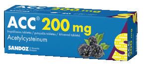 telefonu 8 800 50005 arba www.eurovaistine.lt. „EUROVAISTINĖLĖS“ ACC, nereceptiniai vaistiniai preparatai. Veikliosios medžiagos ir stiprumas. Viename ACC , 20 mg/ml, geriamojo tirpalo ml yra 20 mg acetilcisteino; vienoje ACC , 200 mg, šnypščiojoje tabletėje yra 200 mg acetilcisteino; vienoje ACC , 600 mg, šnypščiojoje tabletėje yra 600 mg acetilcisteino. Terapinės indikacijos. Gleivių skystinimas sergant ūminėmis ar lėtinėmis bronchų bei plaučių ligomis, kurių metu būna sutrikusi gleivių gamyba bei šalinimas. Vartojimo būdas ir dozavimas. 2–5 metų vaikams skiriama po 100 mg acetilcisteino 2 arba 3 kartus per parą; 6–14 metų vaikams skiriama po 100 mg acetilcisteino 3 kartus per parą arba 200 mg acetilcisteino 2 kartus per parą; vyresniems kaip 14 metų pacientams skiriama po 300 mg acetilcisteino 2 kartus per parą arba 1 kartą per parą 600 mg acetilcisteino. Tabletę reikia gerti ištirpinus stiklinėje vandens. Tirpalą vartoti per burną pasinaudojant pakuotėje esančiu švirkštu ar matavimo taurele. Kontraindikacijos. Geriamasis tirpalas ACC ir šnypščiosios tabletės ACC , 200 mg, netinka jaunesniems nei 2 metų vaikams; šnypščiosios tabletės ACC LONG , 600 mg, netinka jaunesniems nei 14 metų vaikams. ACC negalima vartoti, jeigu yra padidėjęs jautrumas acetilcisteinui arba kitoms sudedamosioms medžiagoms. Specialūs įspėjimai. Acetilcisteino vartojimas, ypač ankstyvojo gydymo