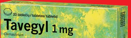 vabzdžių įgėlimui ir įkandimui gydyti. Vartojimo būdas ir dozavimas. Suaugusiesiems ir vyresniems kaip 12 m. vaikams – 2 kartus per parą iš ryto ir vakare gerti po 1 tabletę (1 mg); 6–12 m. vaikams – prieš pusryčius ir vakare prieš miegą po 0,5 (0,5 mg) arba 1 (1 mg) tabletę; 3–6 m. vaikams –prieš pusryčius ir vakare prieš miegą po 0,5 tabletės (0,5 mg). Tabletes reikėtų gerti prieš valgį užsigeriant vandeniu. Vartoti tik per burną. Kontraindikacijos. Padidėjęs jautrumas klemastinui, kitokiems antihistamininiams vaistiniams preparatams ar bet kuriai kitai pagalbinei medžiagai, porfirija, pacientas jaunesnis negu 3 m. vaikas. Specialūs įspėjimai ir atsargumo priemonės. Atsargiai vartoti turi pacientai, sergantys: uždaro kampo glaukoma; stenozę sukeliančia peptine opa; dvylikapirštės žarnos obstrukcija; prostatos hipertrofija, dėl kurios susilaiko šlapimas, bei šlapimo pūslės