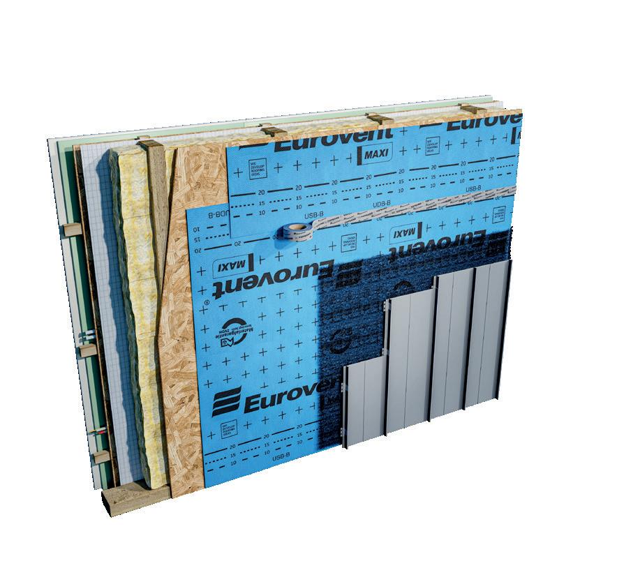 Roofing membrane integrated with an 8mm high separation mat. This solution provides acoustic insulation and drains condensation from under the roofing sheet. In addition, the membrane is highly vapour-permeable and tear-resistant. › Application of Eurovent® METALLIC as a housewrap in timber frame wall with facade of metal panel finished with standing seam.