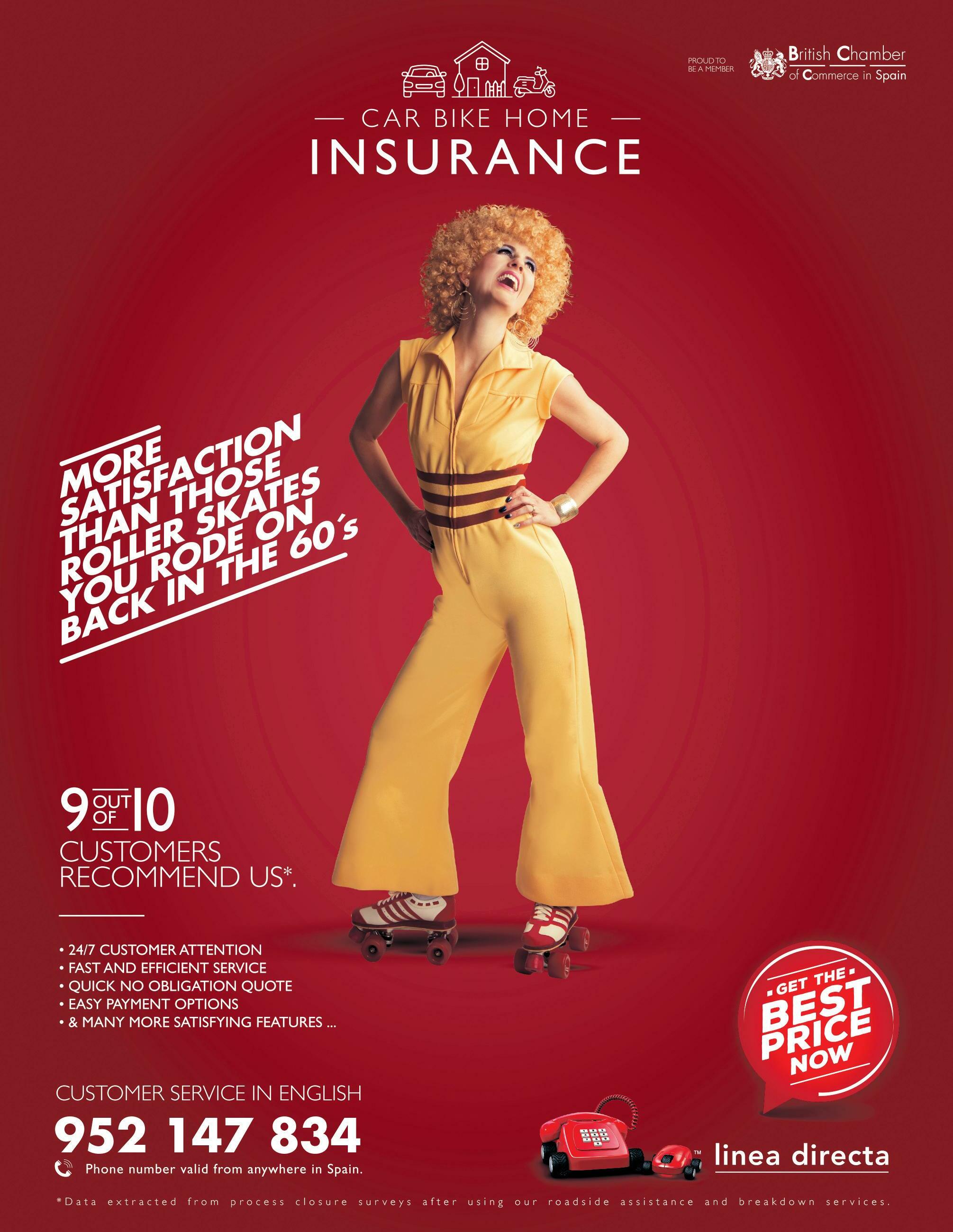 WE ARE currently the market leader in our country in the sale of di rect car, motorbike, home and company fleet insur ance. Since we started out in 1995, our philoso phy has always been to offer an excellent service with the best prices in the market. For the most competitive quotes in En glish, call Linea Directa on 952 147 834. (200726)