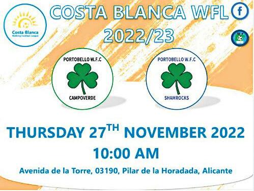 Thursday November 27 is the date for what should be an interesting ‘derby’ CBWFL match, when League Champi ons Portobello Campoverde host local rivals Portobello Shamrocks.