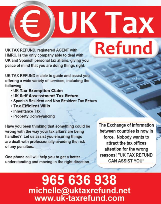 THE SALVATION ARMY English Speaking Church of Denia Worship Service. Sunday 10.30am followed by a time of Fellowship. Everyone is welcome. Come as you are! For more information: Dieter Zimmerer +34 698 609 658 or Barbara Zimmerer +34 652 319 810 Email dieterzimmerer@hotmail.com, www.centrosaron.com (10008) www.helpbenidorm.org and on Facebook VOLUNTEERS NEEDED, particularly if you speak Spanish, and have a car (although this is not essential). Tel President 607 387 040. We are an English-speaking charity that assists residents and tourists of all nationalities in times of crisis. We meet every Thursday at 11am in Jose Llorca Social Centre C. Goya s/n. Benidorm. We loan out mobility and medical equipment including oxygen concentrators on a short-term basis. (288658)