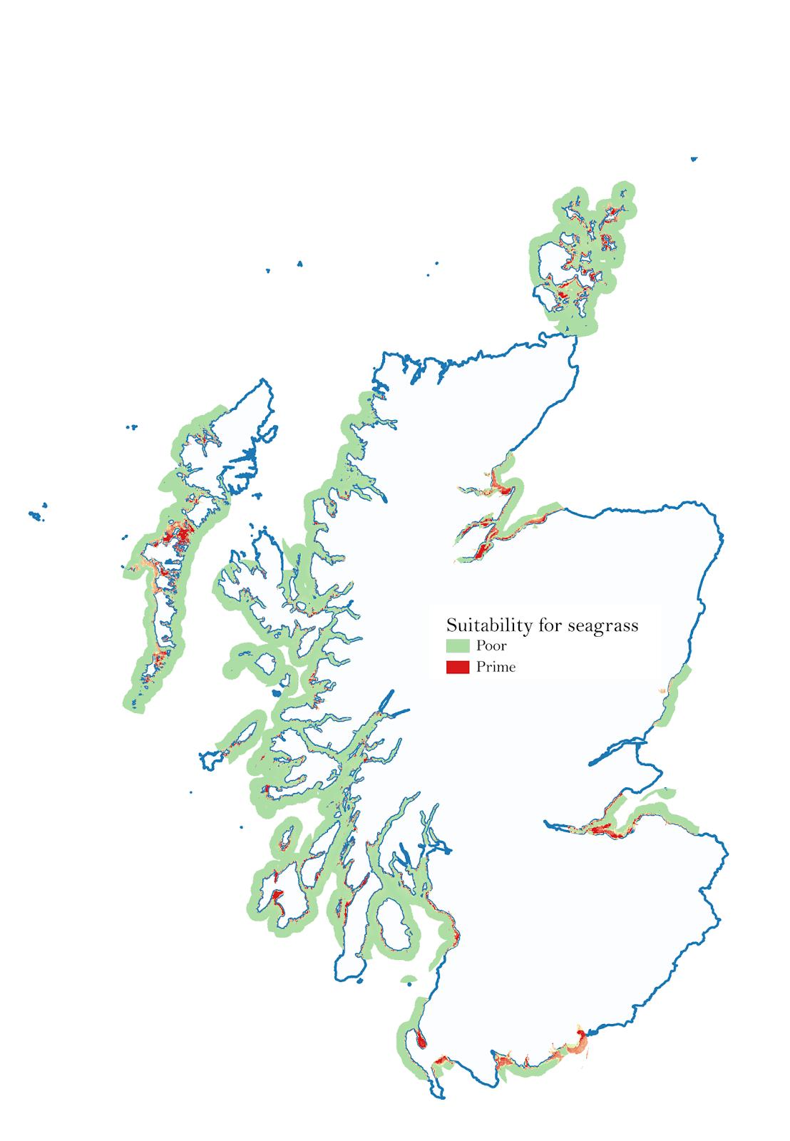 In a nutshell, seagrasses show a preference towards shallow, sheltered waters with gentle slopes and soft sediments. With these factors in mind, we rated Scottish waters for seagrass suitability. Starting off with records of seagrass presence and environmental datasets, we built a model predicting how suitable a certain location would be for seagrass and used this to map the Scottish coastline.