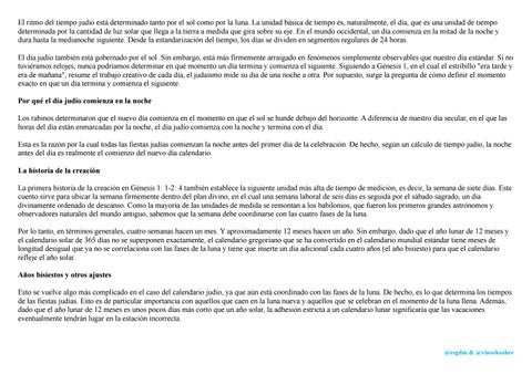El ritmo del tiempo judío está determinado tanto por el sol como por la luna. La unidad básica de tiempo es, naturalmente, el día, que es una unidad de tiempo determinada por la cantidad de luz solar que llega a la tierra a medida que gira sobre su eje. En el mundo occidental, un día comienza en la mitad de la noche y dura hasta la medianoche siguiente. Desde la estandarización del tiempo, los días se dividen en segmentos regulares de 24 horas. El día judío también está gobernado por el sol. Sin embargo, está más firmemente arraigado en fenómenos simplemente observables que nuestro día estándar. Si no tuviéramos relojes, nunca podríamos determinar en qué momento un día termina y comienza el siguiente. Siguiendo a Génesis 1, en el cual el estribillo "era tarde y era de mañana", resume el trabajo creativo de cada día, el judaísmo mide su día de una noche a otra. Por supuesto, surge la pregunta de cómo definir el momento exacto en que un día termina y comienza el siguiente. Por qué el día judío comienza en la noche Los rabinos determinaron que el nuevo día comienza en el momento en que el sol se hunde debajo del horizonte. A diferencia de nuestro día secular, en el que las horas del día están enmarcadas por la noche, el día judío comienza con la noche y termina con el día. Esta es la razón por la cual todas las fiestas judías comienzan la noche antes del primer día de la celebración. De hecho, según un cálculo de tiempo judío, la noche antes del día es realmente el comienzo del nuevo día calendario. La historia de la creación La primera historia de la creación en Génesis 1: 1-2: 4 también establece la siguiente unidad más alta de tiempo de medición, es decir, la semana de siete días. Este cuento sirve para ubicar la semana firmemente dentro del plan divino, en el cual una semana laboral de seis días es seguida por el sábado sagrado, un día divinamente ordenado de descanso. Como la mayoría de las unidades de medida se remontan a los babilonios, que fueron los primeros grandes astrónomos y observadores naturales del mundo antiguo, sabemos que la semana debe coordinarse con las cuatro fases de la luna. Por lo tanto, en términos generales, cuatro semanas hacen un mes. Y aproximadamente 12 meses hacen un año. Sin embargo, dado que el año lunar de 12 meses y el calendario solar de 365 días no se superponen exactamente, el calendario gregoriano que se ha convertido en el calendario mundial estándar tiene meses de longitud desigual que ya no se correlaciona con las fases de la luna y tiene que inserte un día adicional cada cuatro años (el año bisiesto) para que el calendario refleje el año solar. Años bisiestos y otros ajustes Esto se vuelve algo más complicado en el caso del calendario judío, ya que aún está coordinado con las fases de la luna. De hecho, es lo que determina los tiempos de las fiestas judías. Esto es de particular importancia con aquellos que caen en la luna nueva y aquellos que se celebran en el momento de la luna llena. Además, dado que el año lunar de 12 meses es unos pocos días más corto que un año solar, la adhesión estricta a un calendario lunar significaría que las vacaciones eventualmente tendrán lugar en la estación incorrecta.