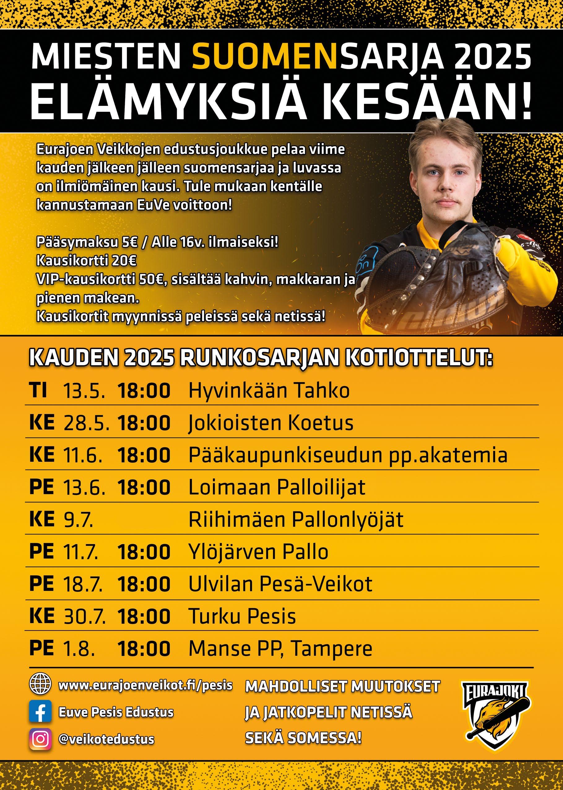 Uusi pesiskausi kolkuttelee jo ovella, ja EuVe Pesiksen huippukunnossa olevat pelaajat ovat jälleen valmiina viemään pelin uudelle tasolle! Miesten aluesarjan joukkueeseen on koottu Eurajoen ja lähialueiden parhaimmistoa, ja tänä vuonna kentälle astuu myös uusia kasvoja, mutta tilaa löytyy vielä innokkaille– jos sinulla siis on intoa, ota paikka joukkueesta ennen kuin on liian myöhäistä! Pelejä on tiedossa yhteensä kahdeksan, ja vastustajat ovat kivenkovia joukkueita Tampereelta, Kankaanpäästä, Hämeenkyröstä ja Sastamalasta. Tule ja näe, miten EuVe raivaa tiensä voittoon! Kotipelit pelataan Eurajoen Romu