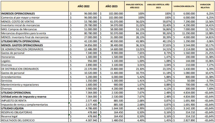 Se realizó un análisis de los gastos, identificando un impacto negativo para la empresa, ya que, en 2023, en comparación con 2022, estos incrementaron un 10,17%. Esto sugiere una menor disponibilidad de activos líquidos y una dependencia significativa de financiamiento externo. Además, se evidenció una reducción considerable en las ventas, que disminuyeron un 14,81% debido a una baja rotación de inventarios. Esta situación afectó directamente el estado financiero de la empresa, reflejándose en una caída del 65,64% en el resultado del ejercicio, lo que representa más de la mitad de las utilidades. Este panorama tiene un impacto directo en las operaciones de la compañía.