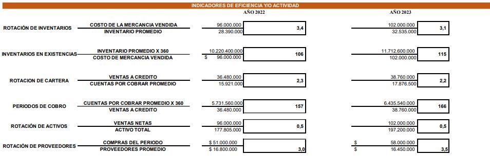 identificar áreas de mejora y a medir la eficiencia operativa. Según los análisis realizados, en 2023 los indicadores mostraron resultados positivos, lo que permitió que la empresa operara de manera eficiente, logrando un buen desempeño en sus actividades y aumentando su productividad. Sin embargo, en 2021 los períodos de cobro y los niveles de inventario fueron más bajos, lo que indicaba una mayor liquidez y flujo de efectivo, optimizando la rentabilidad y evitando problemas relacionados con la falta de disponibilidad de productos.
