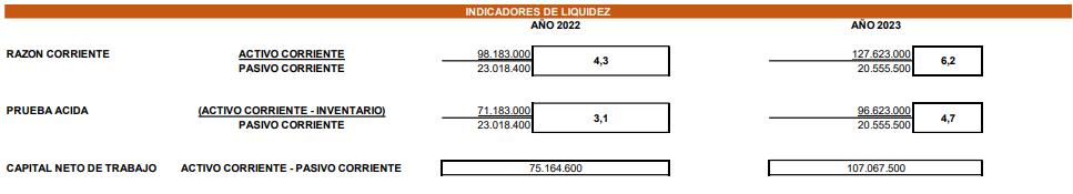 Razón de liquidez: La razón de liquidez refleja la capacidad de una empresa para cumplir con sus obligaciones a corto plazo. En 2022, la razón corriente mostró que la empresa contaba con activos líquidos suficientes para cubrir estas obligaciones. Sin embargo, en 2023, este indicador evidenció un aumento significativo, lo que refleja una excelente liquidez durante ese año, permitiendo cumplir cómodamente con todas las obligaciones financieras a corto plazo.
