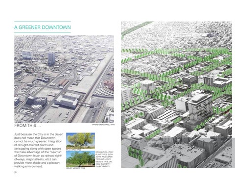 FROM THIS ... Just because the City is in the desert does not mean that Downtown cannot be much greener. Integration of drought-tolerant plants and xeriscaping along with open spaces that take advantage of the “seams“ of Downtown (such as railroad rightof-ways, major streets, etc.) can provide more shade and a pleasant walking environment. 70