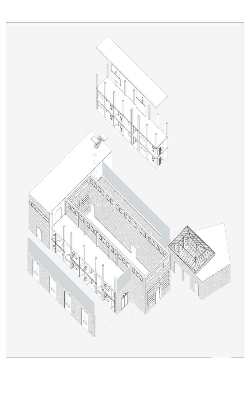 En el proyecto se mantiene toda la estructura y se añade una última altura de muro cortina que contrarreste la solidez del muro anterior. Se juega con las naves del edificio, convirtiendo espacios previamente cubiertos en patios o estancia exteriores.