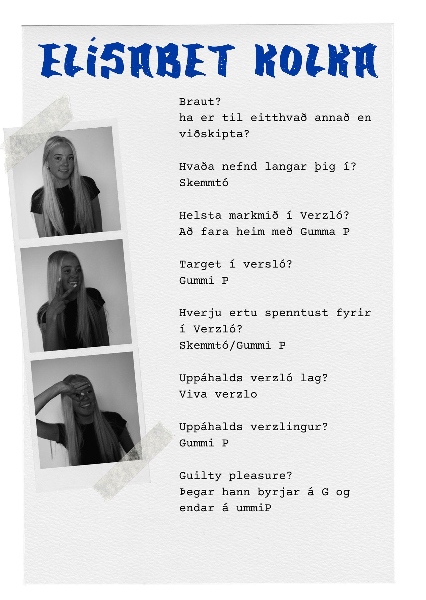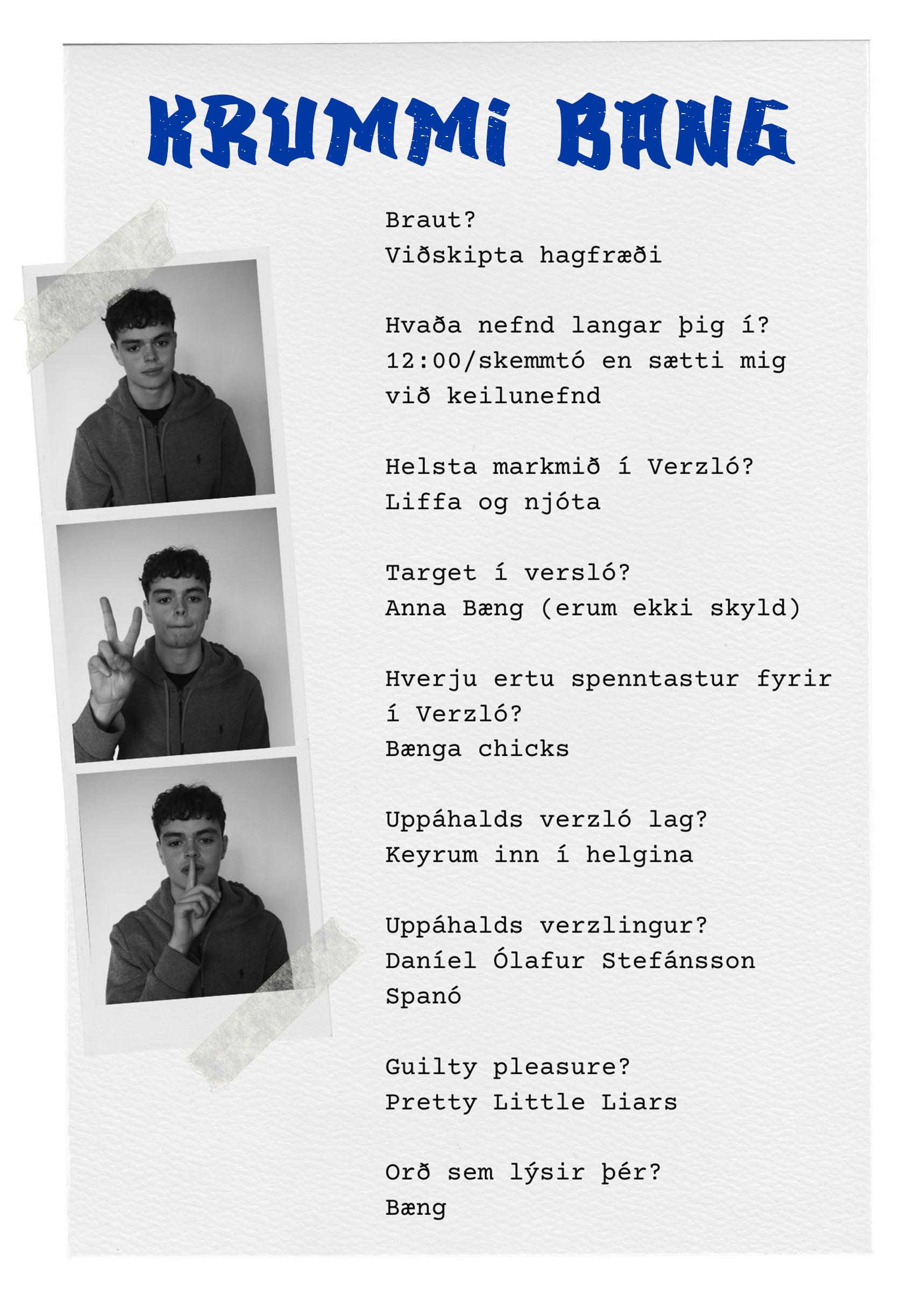 HvaÐa stjórnarmeÐlImur ert þú? Uppáhalds kennari? A: Valur B: Óli Njáll C: Eiki D: Máni Drauma fyrsta deit? B: Bíó D: Rúnta á Ríðunes með ís Uppáhalds stjórnarmeðlimur? A: Aron Atli B: Hekla Sóley C: Aron Ísak D: Karen Hvaða dýr værir þú? A: Api B: Dúfa C: Björn Týpa á djamminu? B: Vlogger, á myndavélinni D: Ælupési Uppáhalds staður? B: Súðavík C: Vestmannaeyjar D: Blái Salur Hvað geriru á föstudögum? B: Djamma D: Ælupésast Uppáhalds kex B: Ballerina C: Homeblest D: Polo Ástarlíf í einu orði C: Fallegt D: N/A Guilty pleasure B: Bananar í bragðaref C: Flóni D: Að baktala