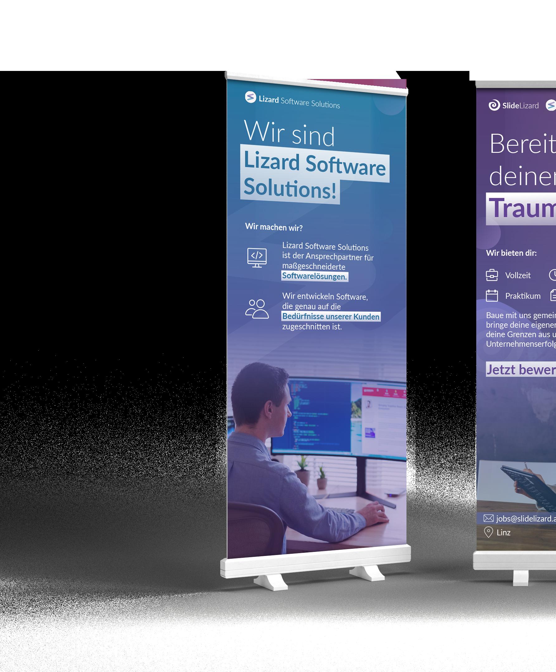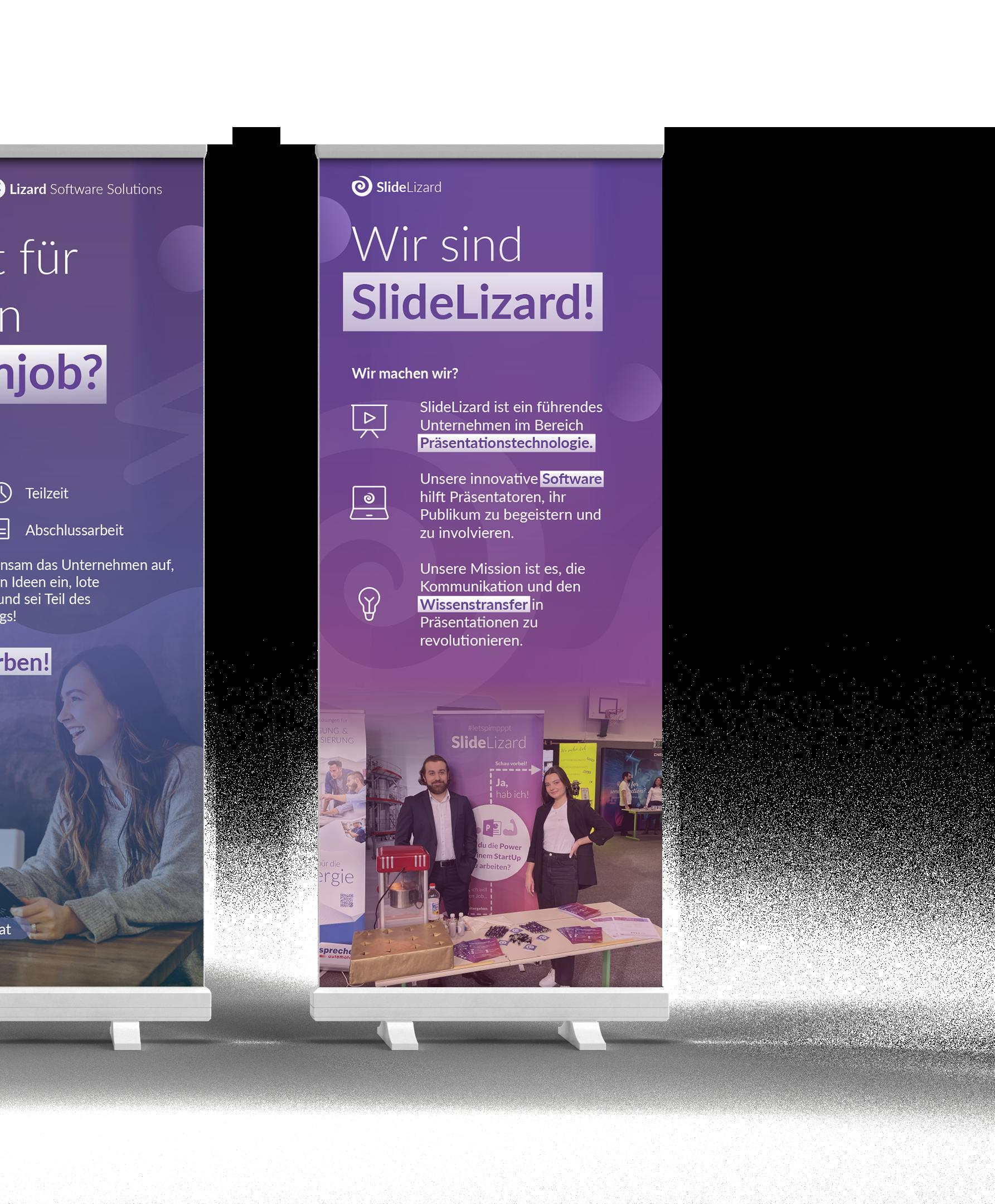 Für den Außenauftritt erstellte ich auch Roll-Up Banner. Dabei legte ich großen Wert auf ein ansprechendes Design und auffällige, eingängige Texte. Die Druckdateien erstellte ich mit Adobe InDesign und die Mockups mit Photoshop.