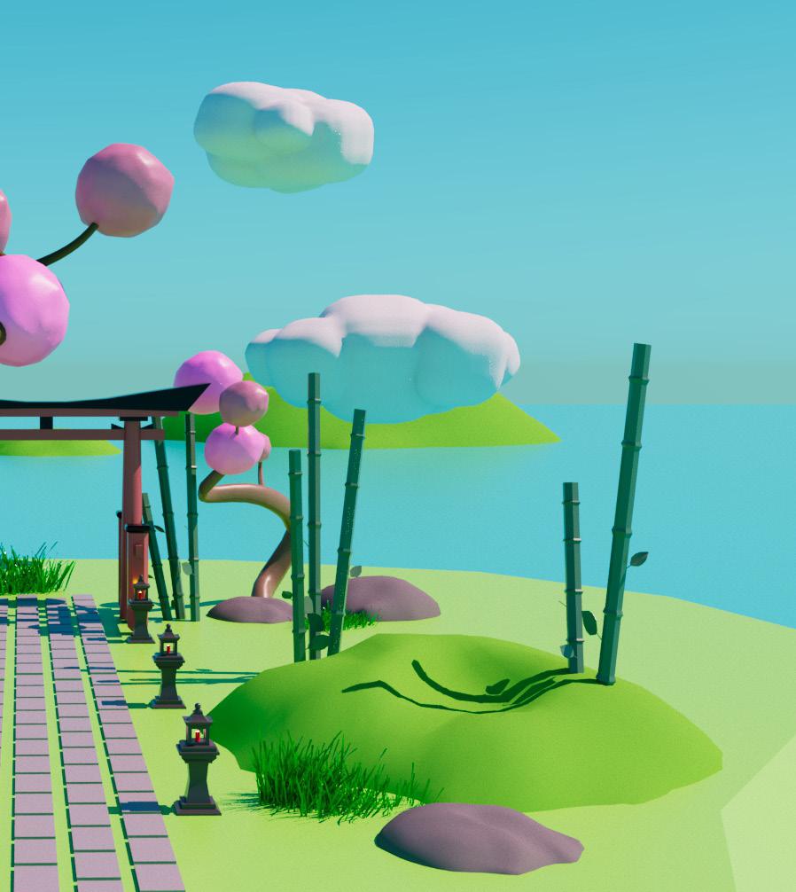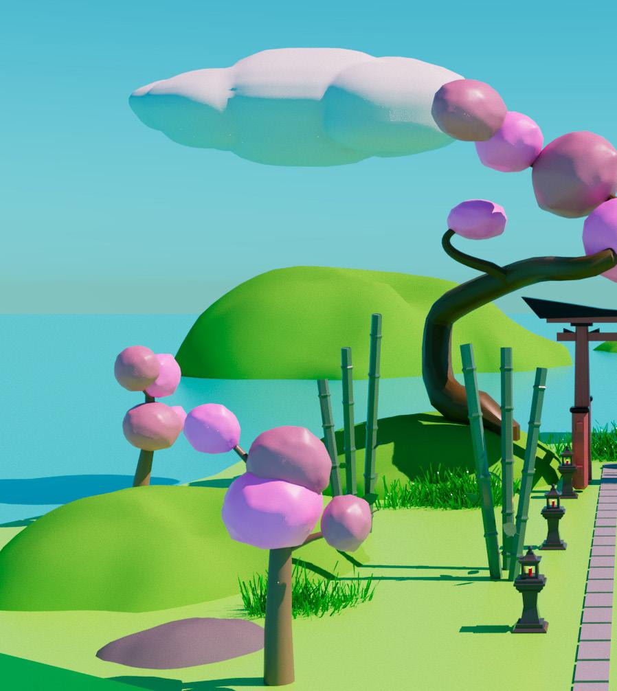 Dieses Projekt entstand als Teil des 3D-Kurses im ersten Semester meines Studiums. Durch die Verwendung von simplen Formen und hellen Farben konnte ich eine cartoonhafte Atmosphäre schaffen, inspiriert von den charakteristischen Torii in Japan.