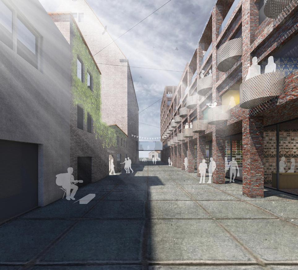Die öffentlich nutzbare Gasse gibt eine reizvolle Blickachse vom östliche Hafenbereich durch das Quartier hindurch über den Fährkanal hinweg bis zur Altstadt mit ihren Türmen frei. Die Maßstabssprünge, die mit den Silos kontrastierende Kleinteiligkeit und der rückwärtige Charme der Häuser „An der Fährbrücke“ werden erlebbar inszeniert. Der neu entstandene Innenhof ist den ihn umfassenden Nutzungen gewidmet und sollte als „grüne Oase“ gestaltet sein.