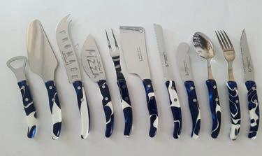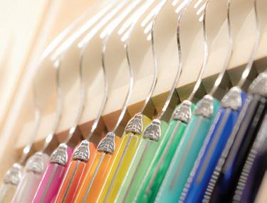 L’acier utilisé pour la collection Berlingot est un acier inoxydable très haut de gamme (X50CV13), associé au méthacrylate (passage au lave-vaisselle) et au bois pour les manches