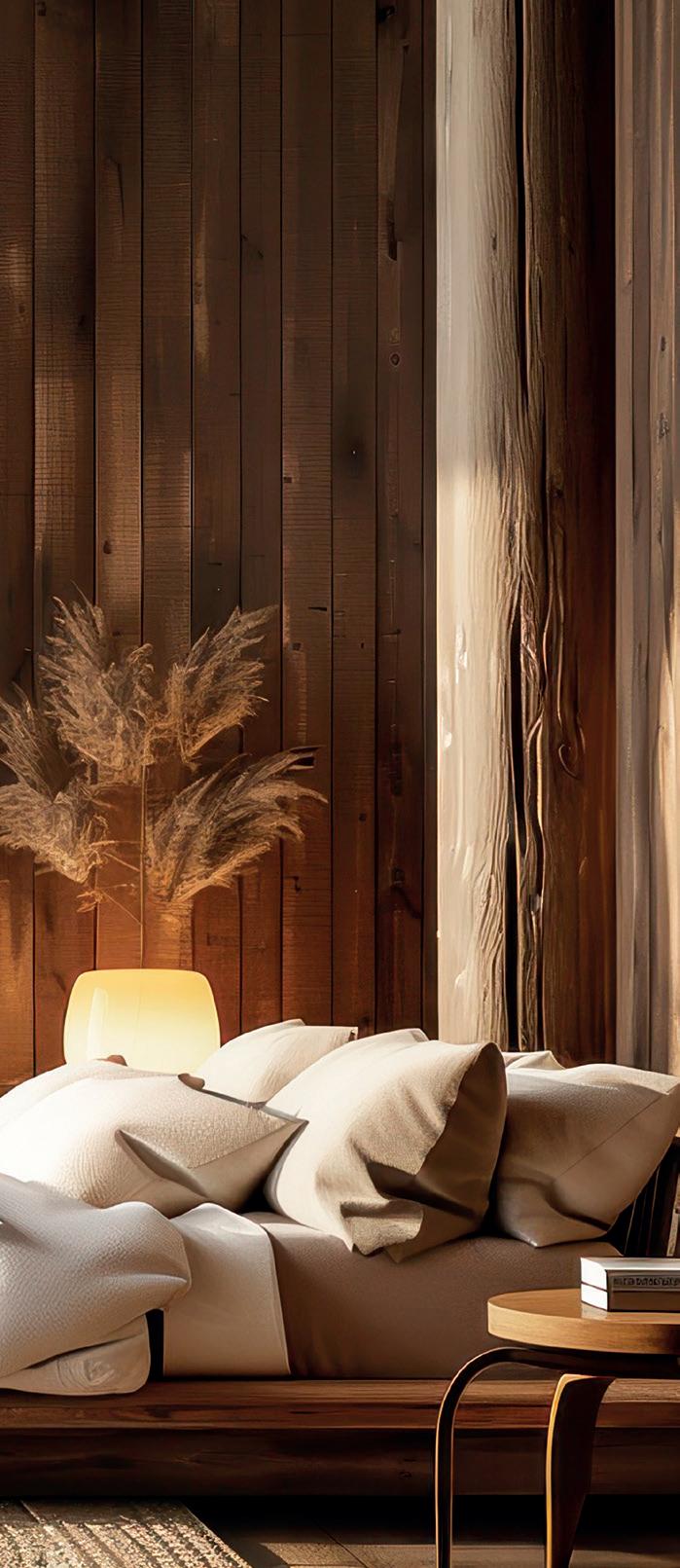 sensation de calme. Optez pour un mobilier minimaliste et pratique, qui laisse suffisamment d’espace pour circuler librement dans la pièce. Les tables de chevet et les rangements intégrés permettent de maintenir un environnement ordonné et dégagé. Pensez à ranger les objets du quotidien hors de vue et évitez de surcharger la chambre avec des éléments de décoration superflus. Les accessoires décoratifs devraient être choisis pour leur capacité à inspirer la sérénité et peuvent inclure des objets en matériaux naturels comme le bois, la céramique ou le lin. Le lit, pièce maîtresse de la chambre, doit être choisi avec soin pour allier confort et esthétique. Un bon matelas et des oreillers de qualité sont essentiels pour assurer un sommeil réparateur. Les draps et les couvertures en matières naturelles, comme le coton ou le lin, offrent un toucher doux et respirant, idéal pour créer un environnement confortable. En optant pour des textiles aux couleurs apaisantes, vous renforcerez l’effet relaxant de la pièce. Les couvertures douillettes et les coussins moelleux ajoutent également un aspect cosy à la chambre, favorisant une atmosphère accueillante.