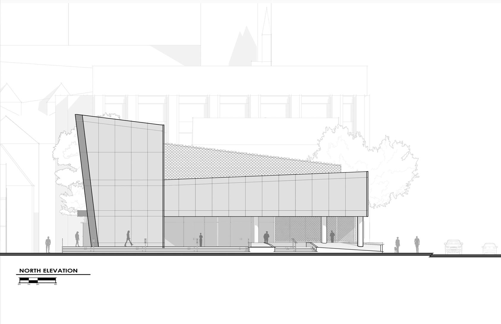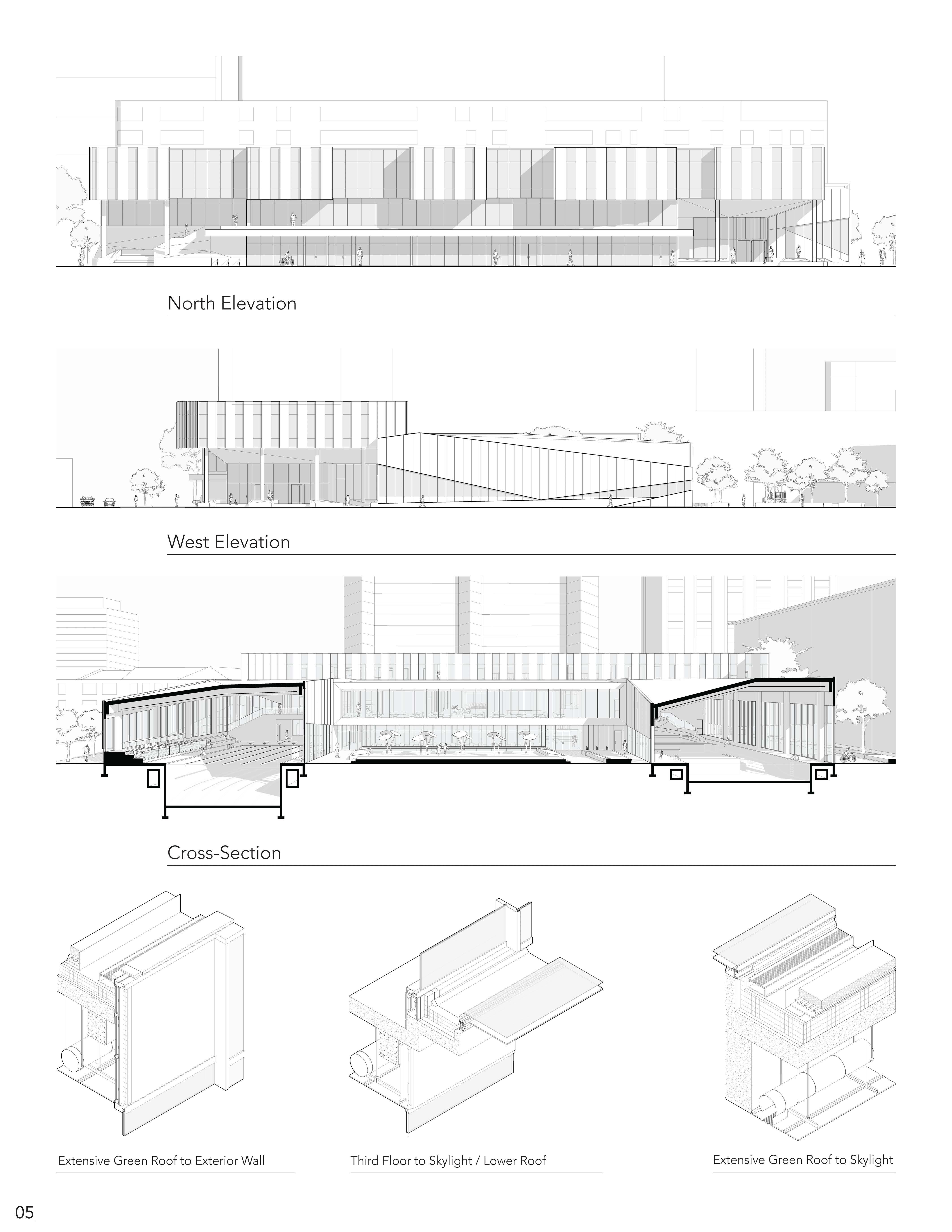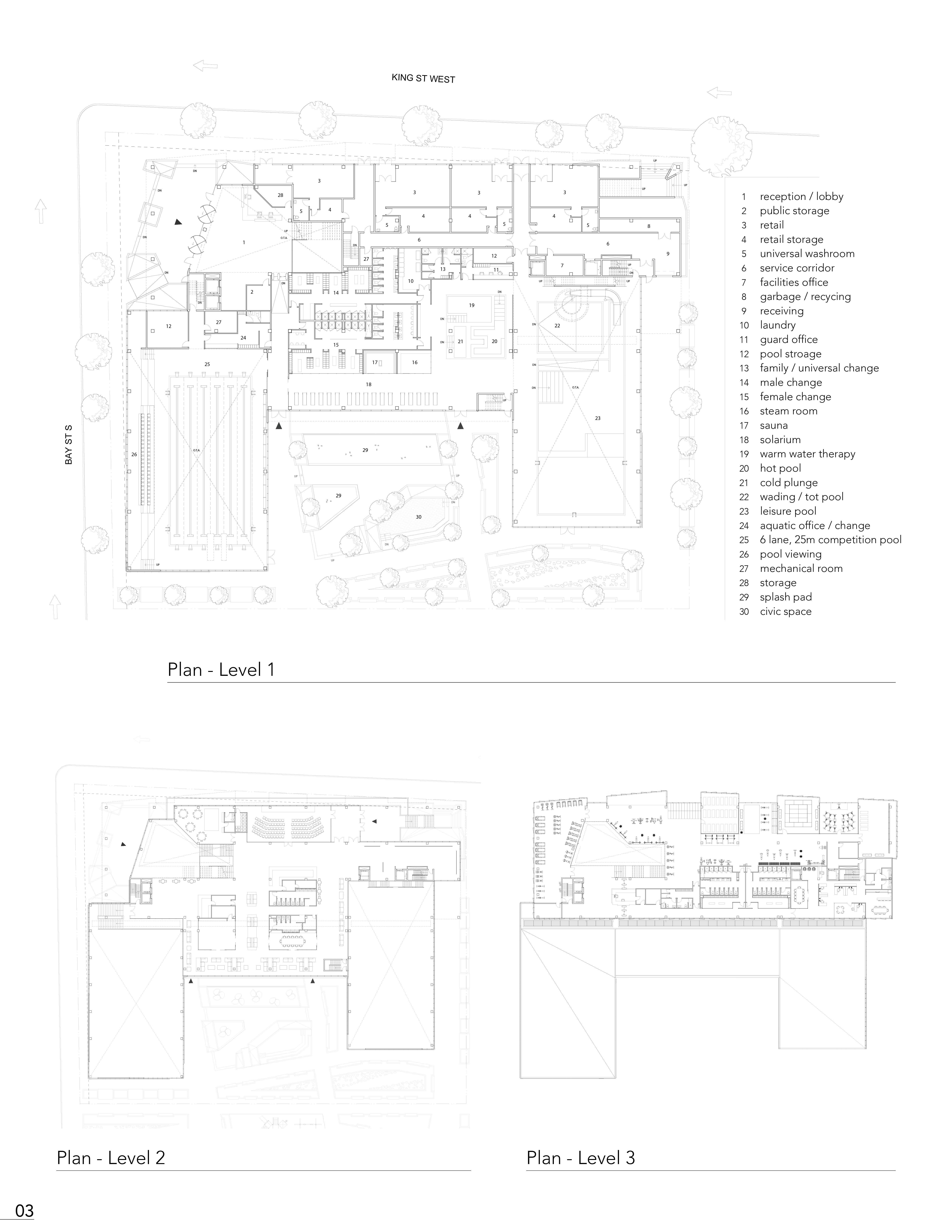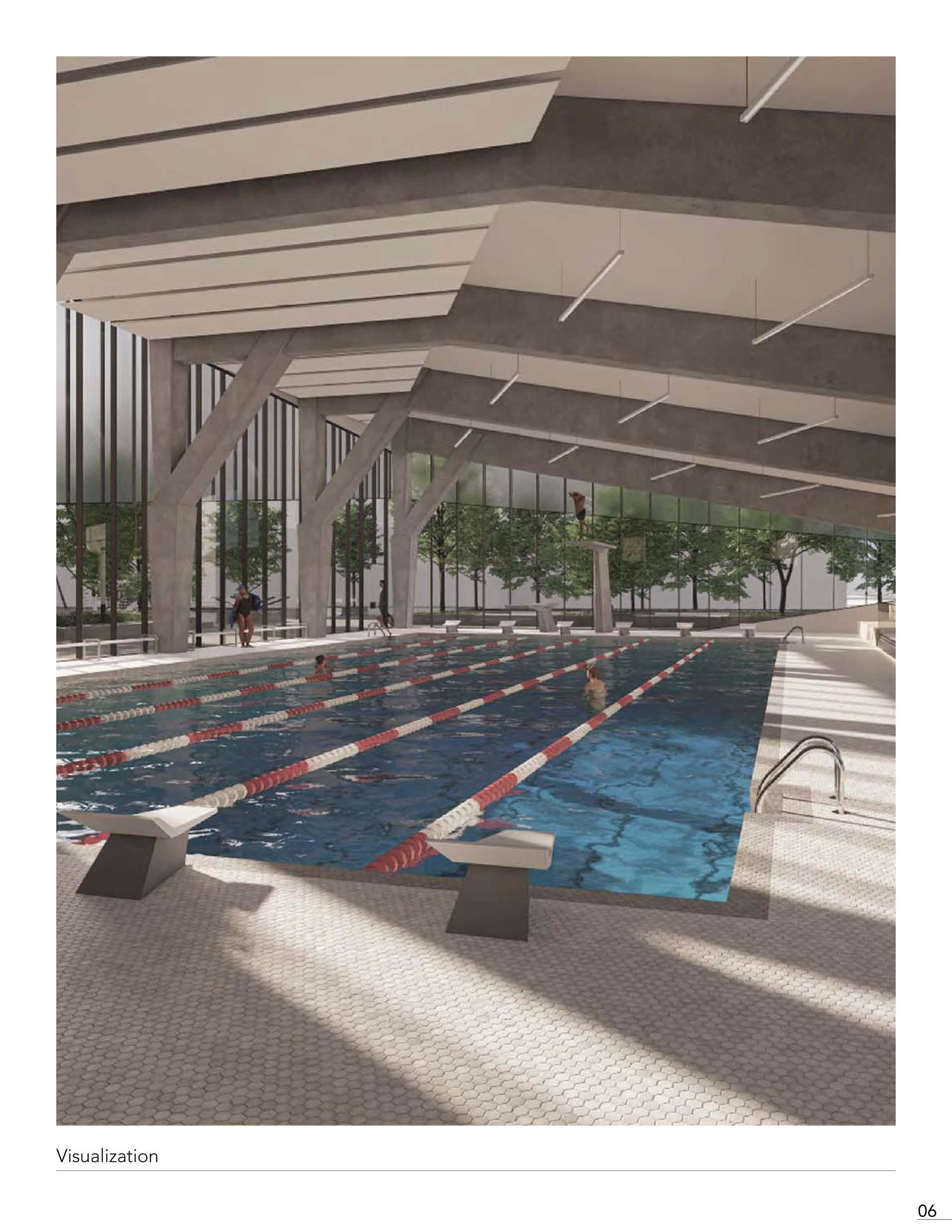 The Hamilton Aquatic Centre illustrates the connection between exterior interaction and internal separation. In developing a prominent street corner in the city of Hamilton, the project expresses depth away from the exterior junction, developing an external concourse that, in relation, provides a disconnect from the public realm. The Aquatic centre serves as a new central space for the downtown district, programmatically encasing athletic spaces, areas for personal well-being development and overall spaces for community engagement. The Aquatic centre follows a U-shaped mass, where the two external wings distinguish themselves with aquatic-focused spaces and community-focused program spaces within. The overall mass follows back to the idea of a central space where an exterior public square is situated in the centre, dividing itself away from the external street frontage, where it is encased within the U-shaped form, giving a sense of privacy to visitors of the aquatic centre.