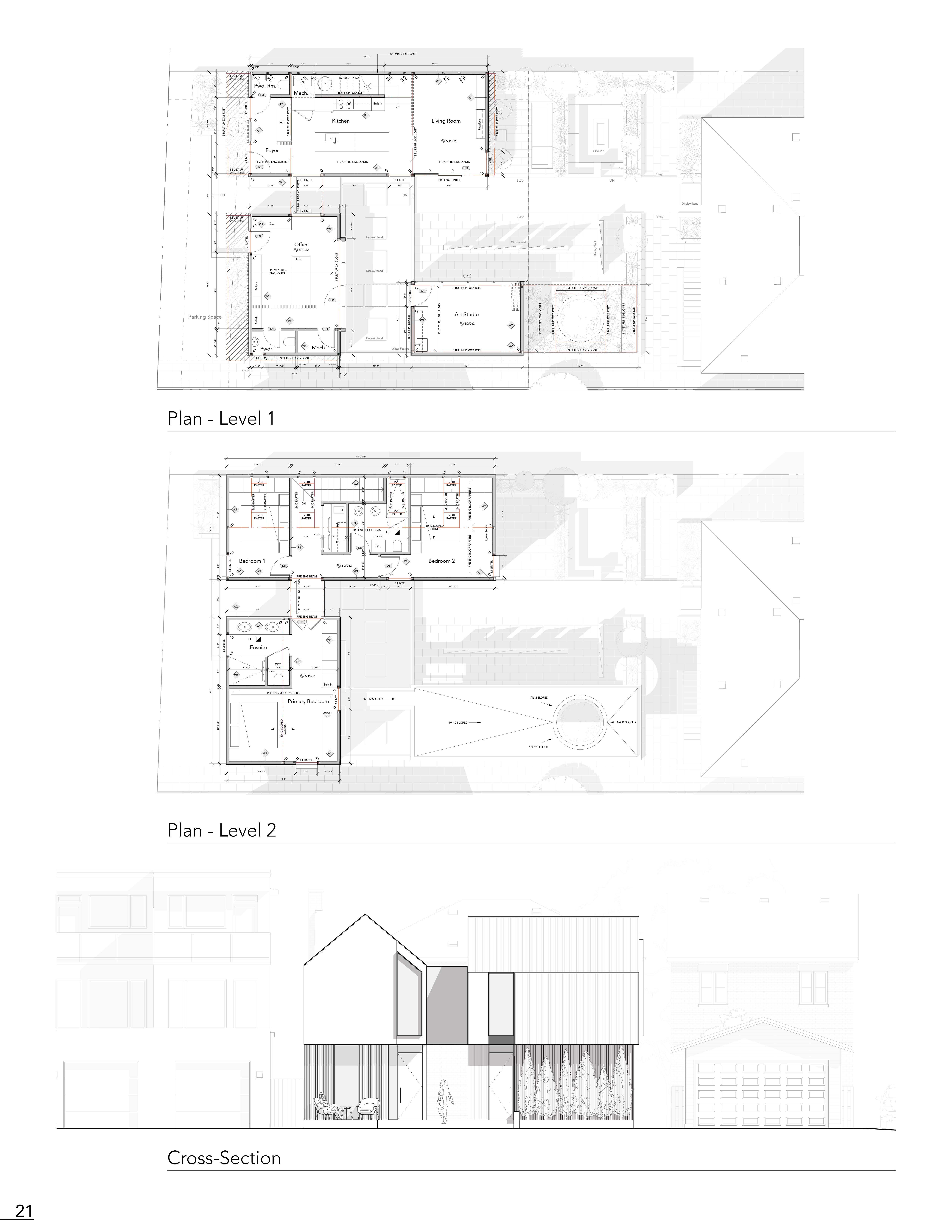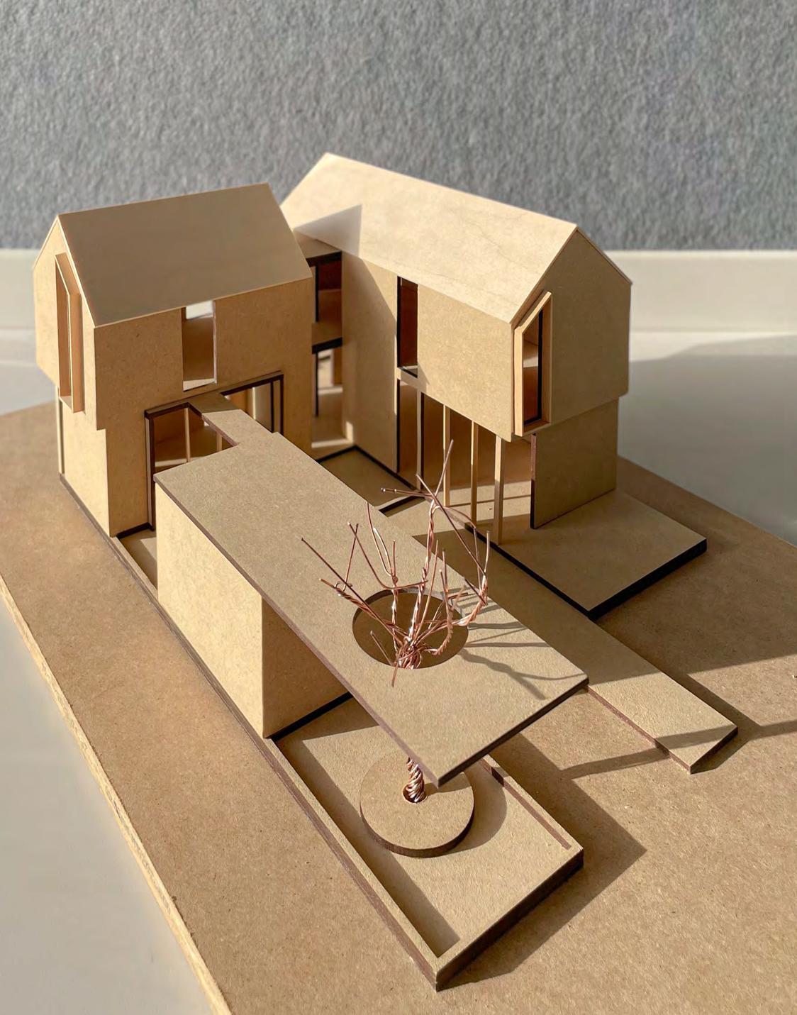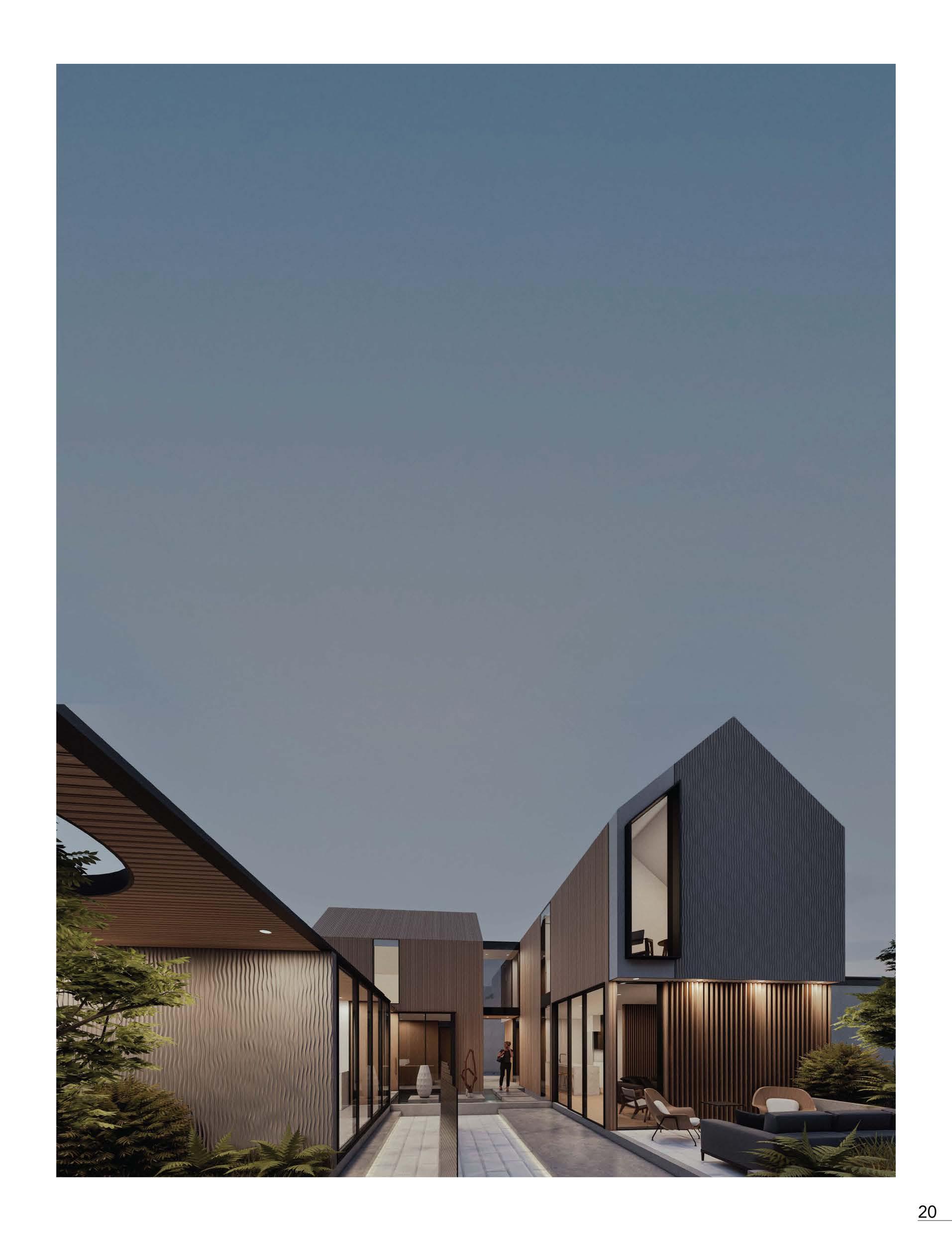 This Laneway Suite expanded the idea of having three programmatic spaces within one small existing rear yard. Through this, the conceptual organization of having a primary living space, a live work and an external studio together on one site, separated into three masses, has been experimented with. The spaces serve as the idea of organizing a live work area, away from the everyday living of a home, creating an externally located office and studio while still falling within the same footprint. The L-shaped mass is separated with an internal bridge connecting the primary suite to the living space while still giving that sense of separation and privacy. This is exaggerated with an external connection through a central corridor of the mass into the rear, delivering the idea of having a rear court displaying one's personal artwork.