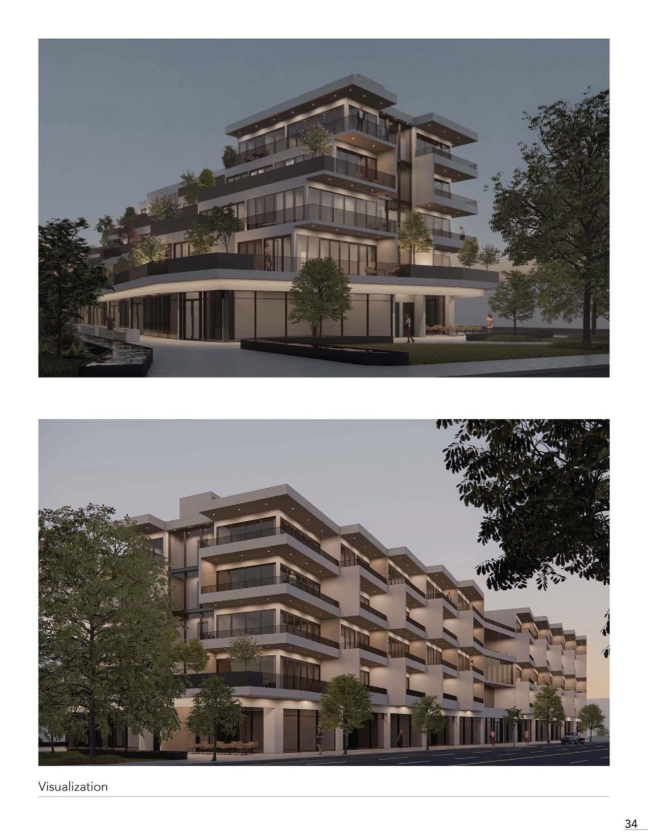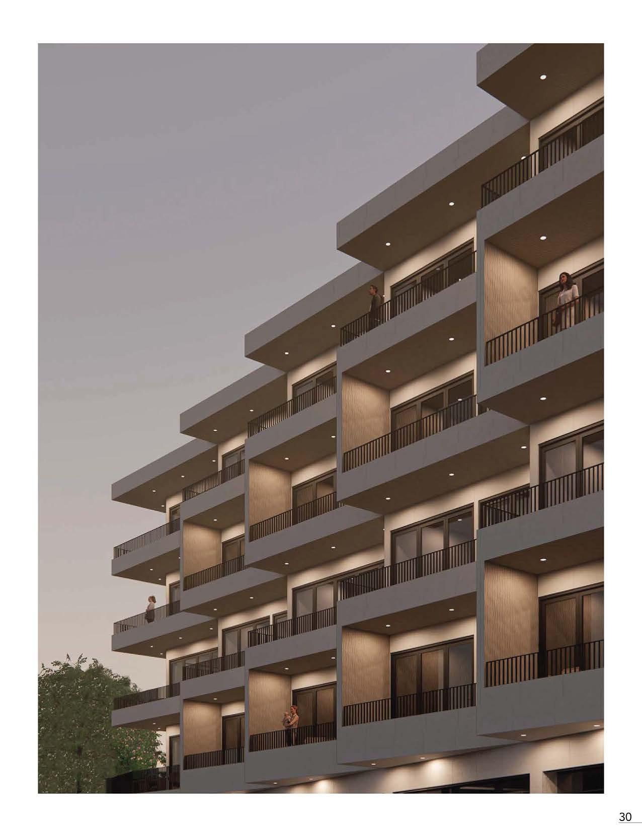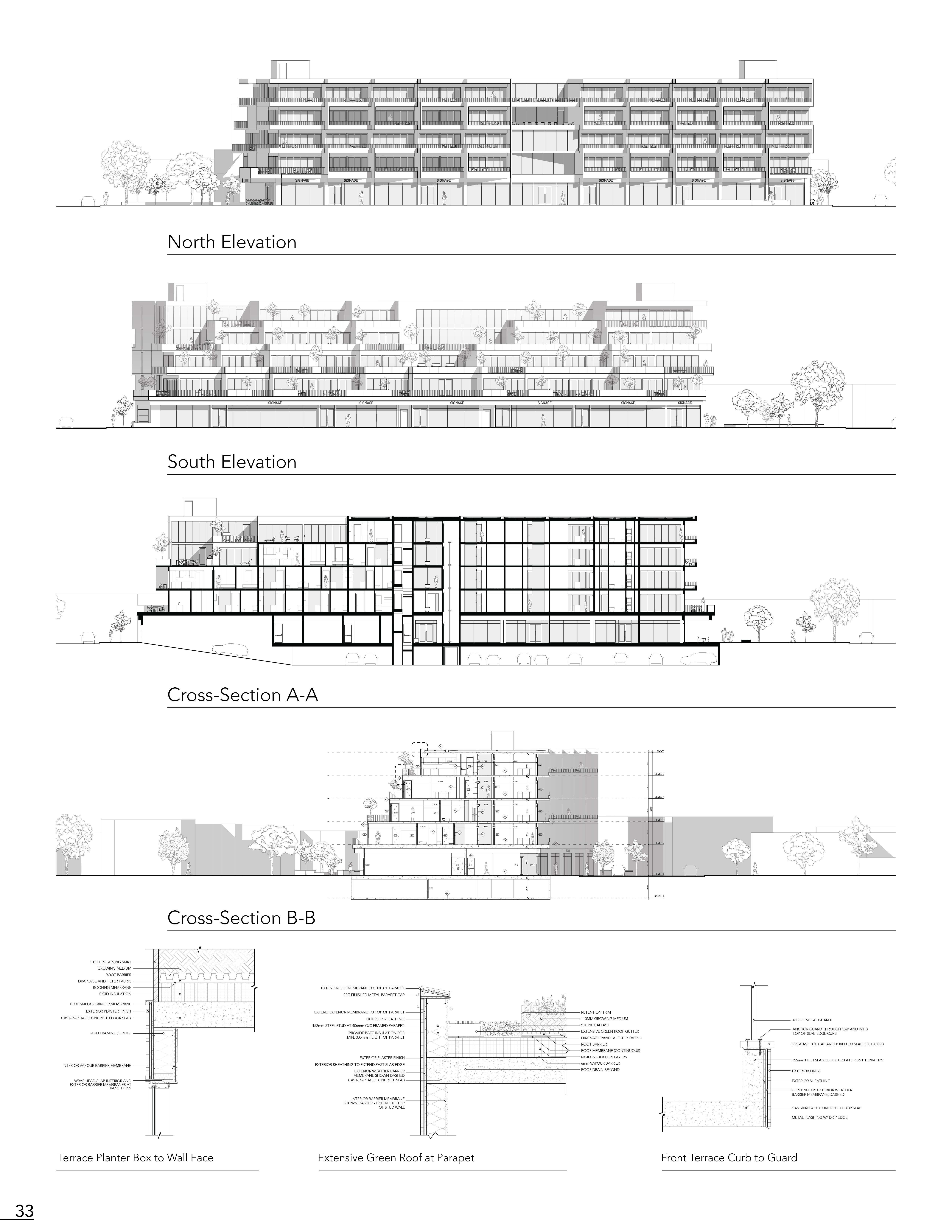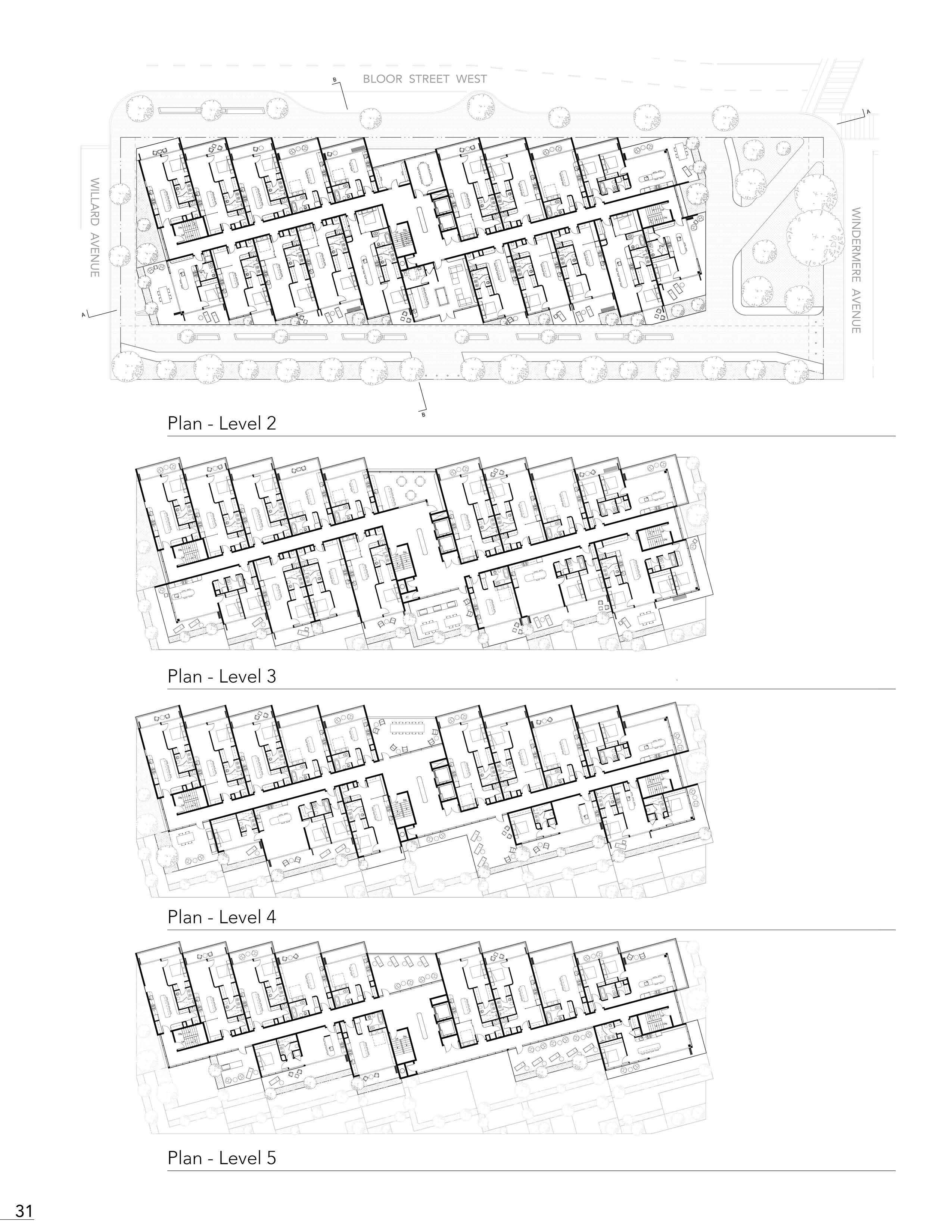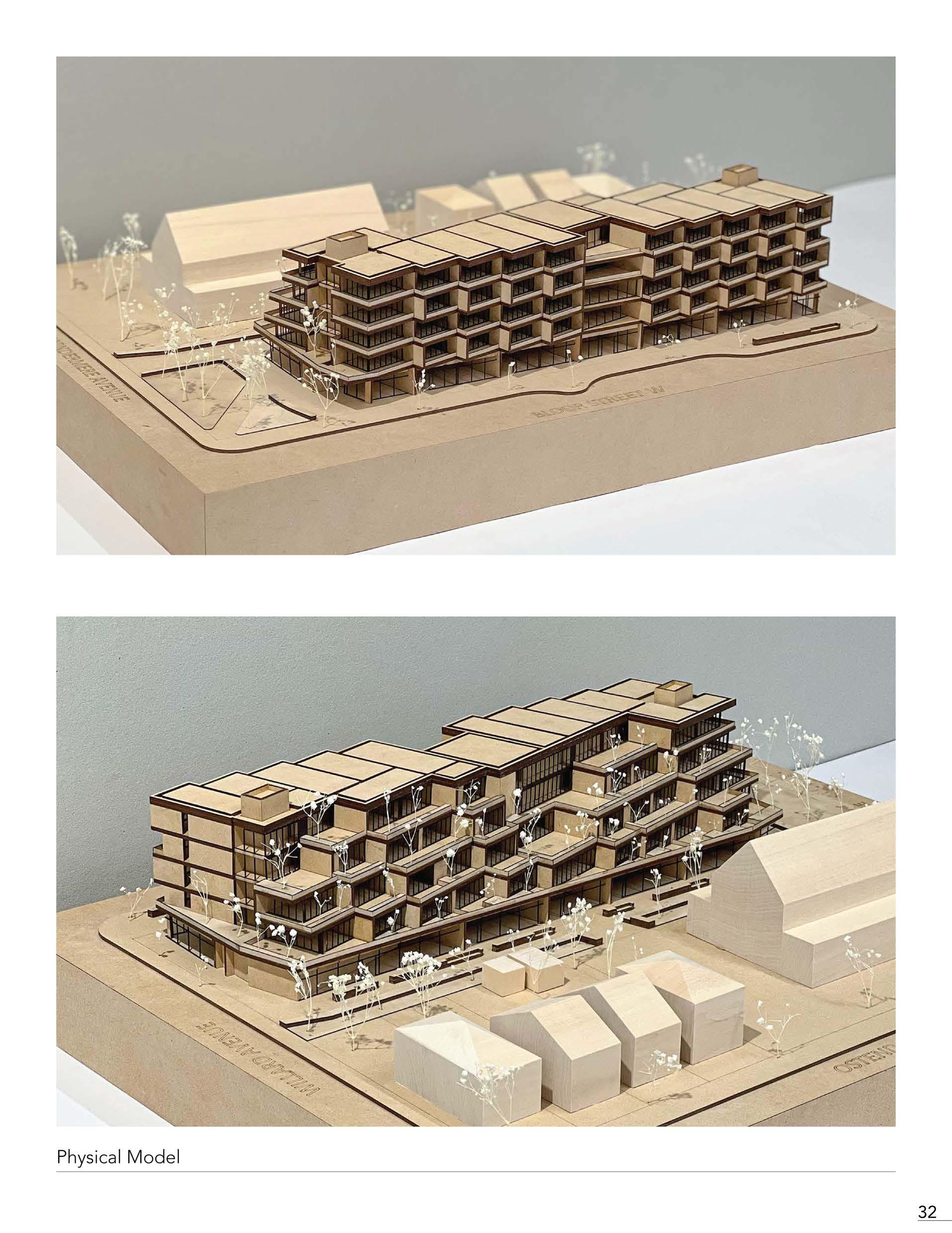 The five-storey mid-rise gives a presence along the street frontage of Bloor Street West. The first floor of the condominium provides retail to the community, which follows the existing commercial characterization of the Bloor West Village. Above, housing residences of Toronto, the vertical extrusion of the mass follows a fifteen-degree rotation through the second to the fifth floor, thus giving a shift in the front facade, breaking up the continuity. While primarily, the angle serves to offset each unit as a separation of privacy in the rear. Following where a terracing effect projects the overall character of the building, giving residences their own garden, while also doubling as privacy separation, thus being the main priority.