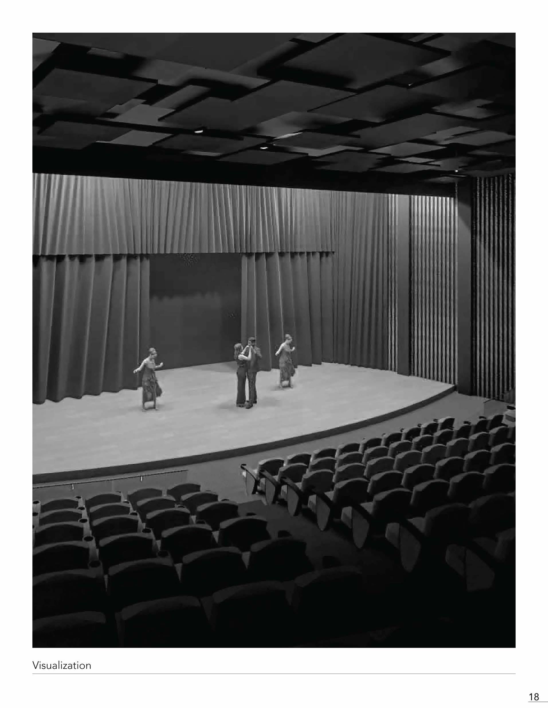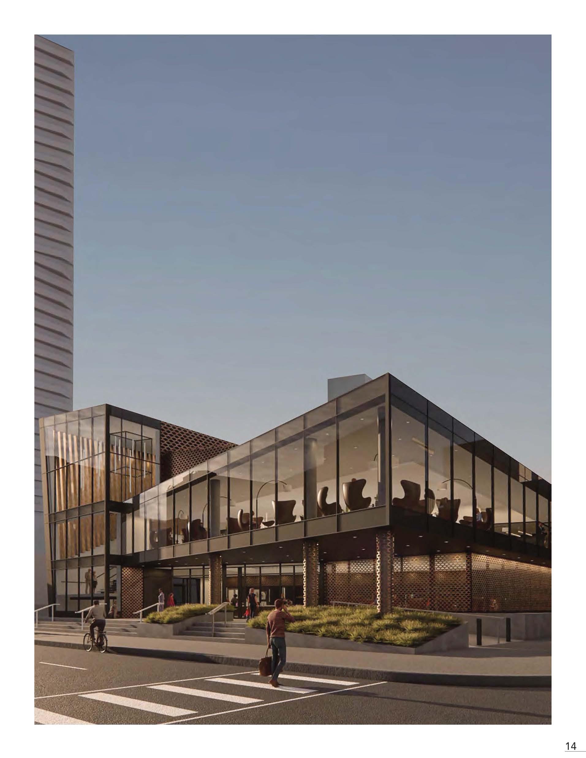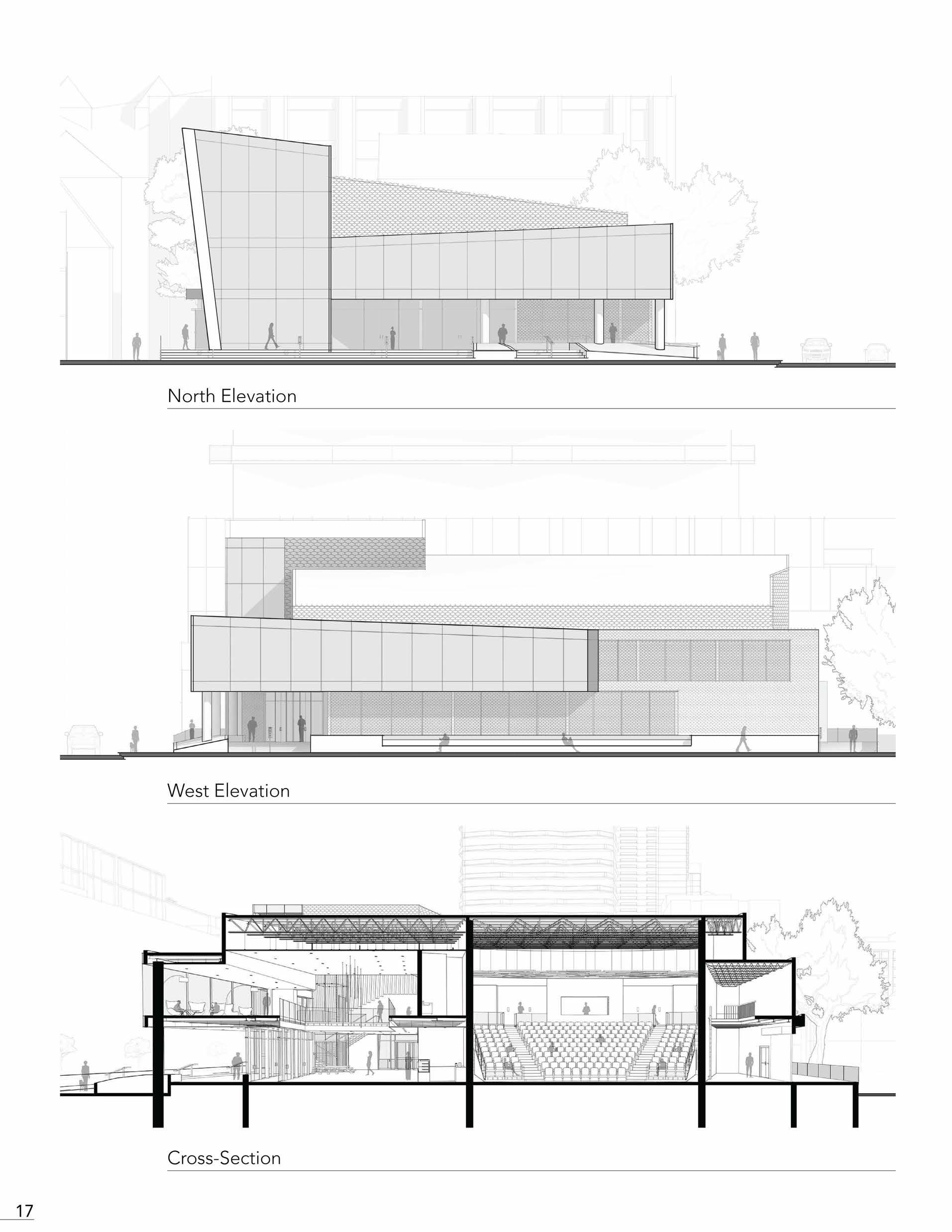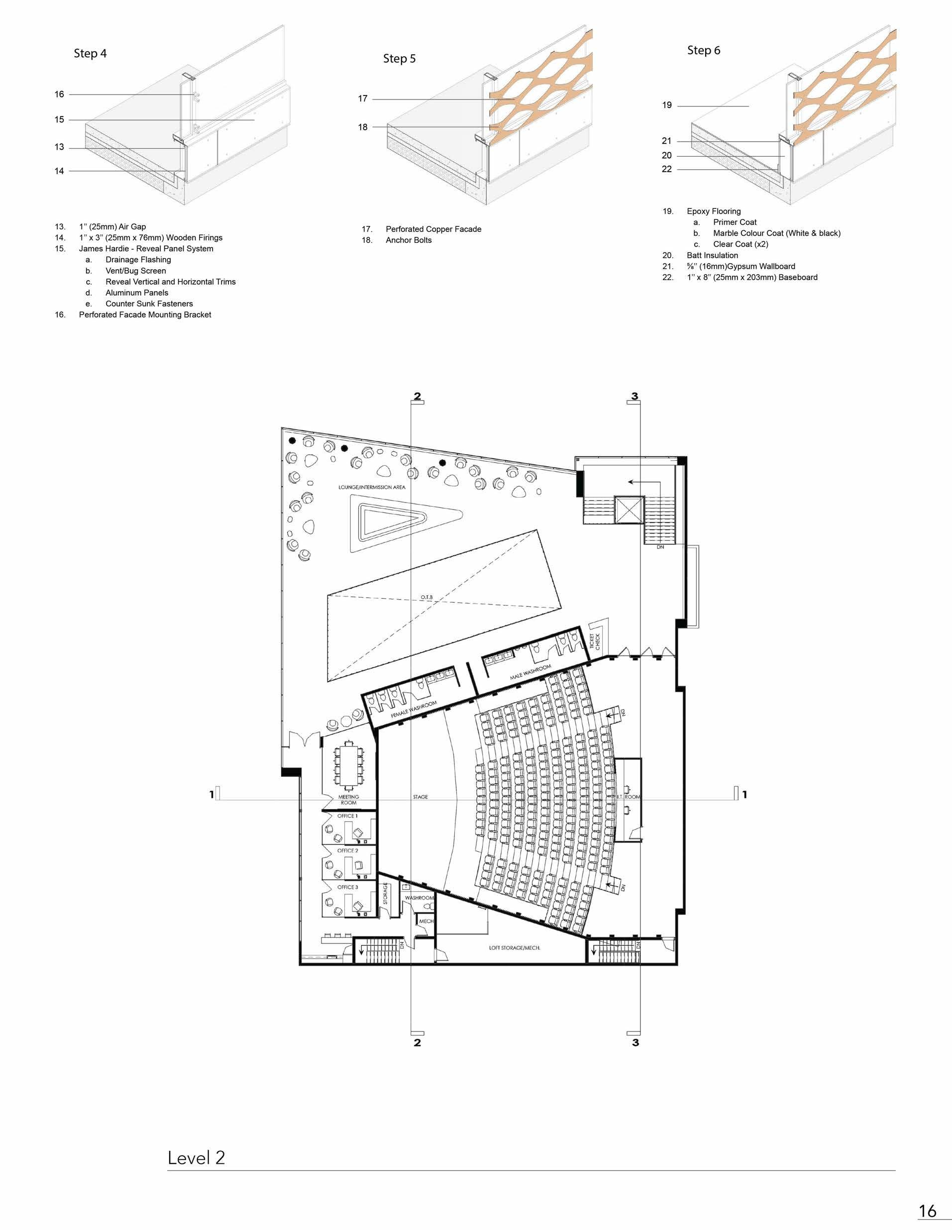 Expressing the visuals of interior circulation towards the exterior, the Performance Hall presents itself outside of the exterior shell. The extrusions through the perforated facade protrude the internal exposure to the exterior. Expressing an extrusion that connects the street corner into external isolation upon entry. Plan 13