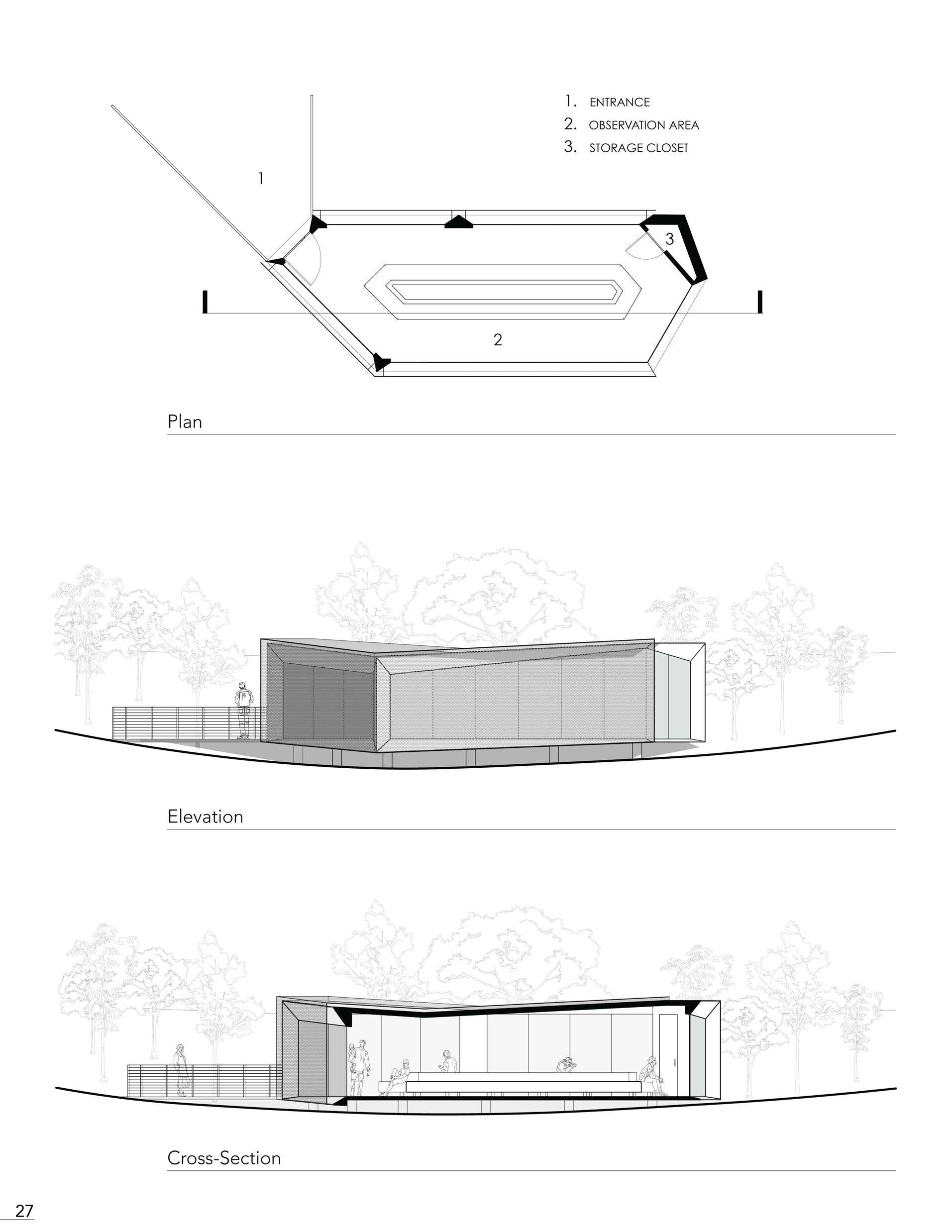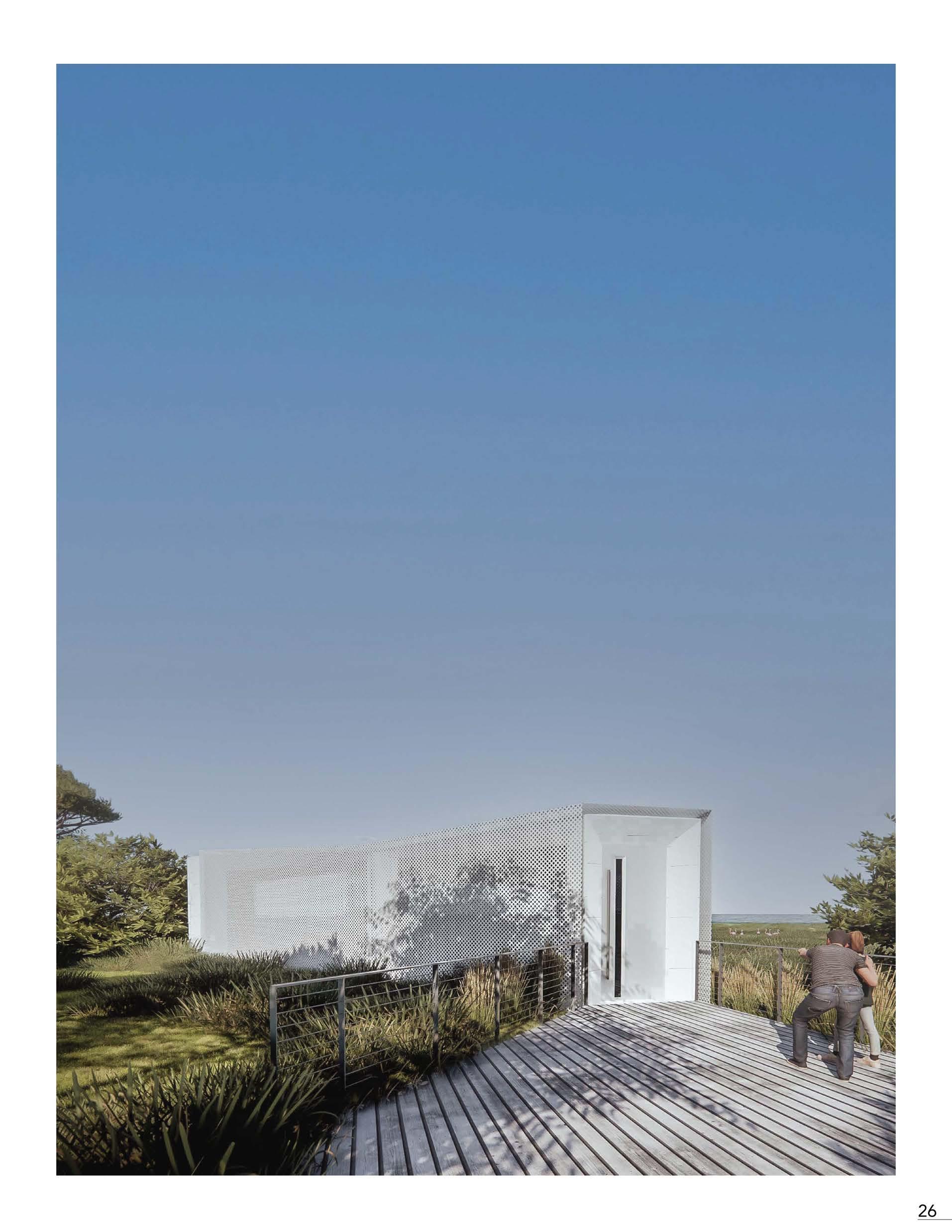 The wetlands: a place one might consider the point of conflict between the natural world and human development. An area historically deemed undesirable to the built world but still so important to the world's biodiversity. A place threatened by our past and present actions. In order to protect and raise awareness of these ecosystems' importance, we must draw attention to this issue. The ground-level observation uses a perforated facade to conceal the viewers within, allowing for sweeping views of the landscape and fauna. The perforated facade and the white steel cladding contrast the structure within the natural landscape's form