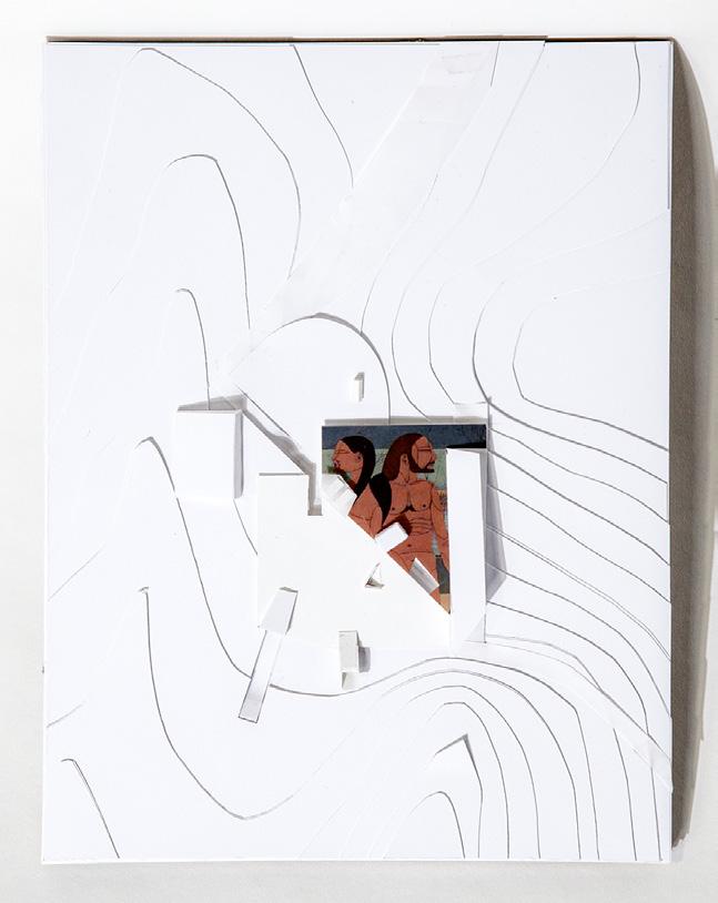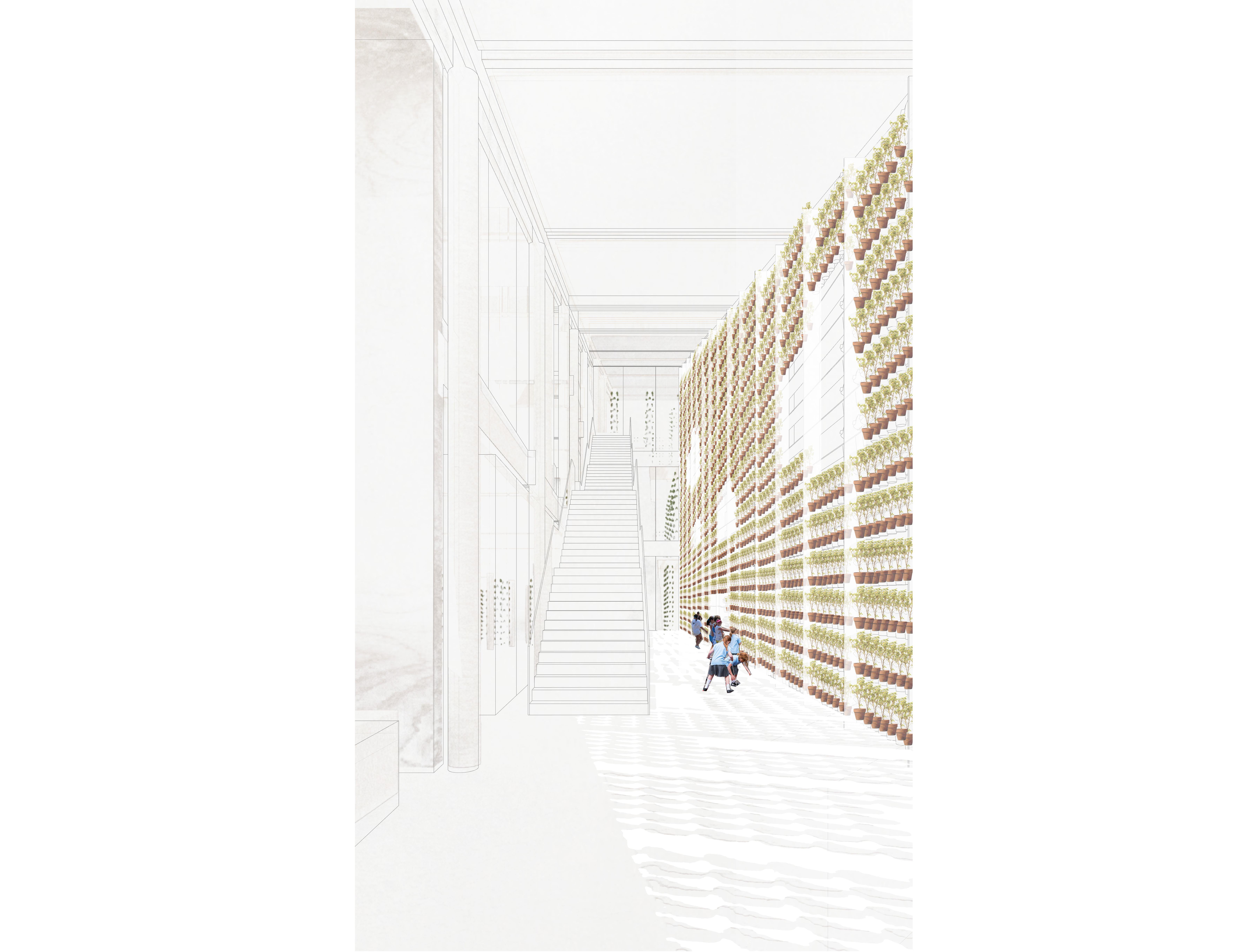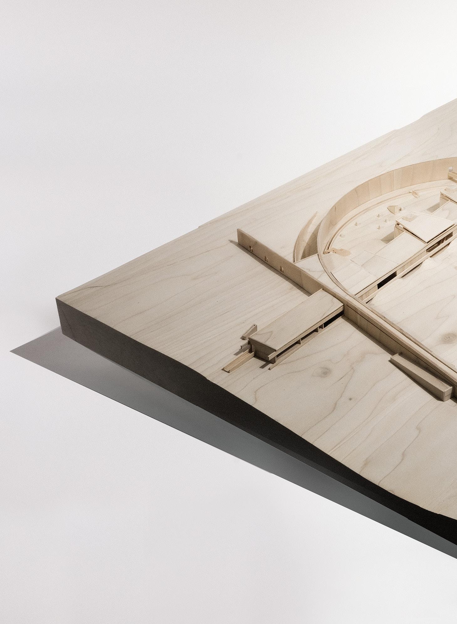 As visitors walk east around the crest of a tree covered hill, they are met with a retaining wall carving an arc around the valley, constituting a new public bay where Nepean Bay once was. A single storey gallery supported by two parallel horizontal timber beams 2 meters above grade bridges the bay; it rests upon the crests of small hills within the bay and on two pre-existing hills beyond the arc. The large hills on either side of the bay are the topographic result of the 1964 municipal landfill. Trees atop these hills are the tallest forms in the landscape. The smaller hills within the bay are constructed landscape, enveloping concrete piers. Points of contact between the gallery and the earth mark entries to communal atria which can be accessed without rising to the level of the galleries. The lifted gallery acts as an elevated threshold, allowing visitors to pass underneath toward large open-air forums contained behind.